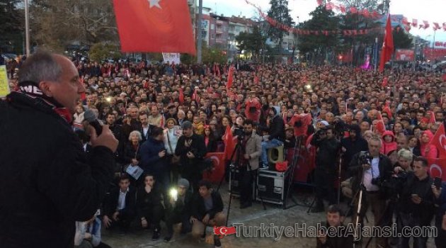 CHP Yalova Milletvekili Muharrem İnce, Kütahya'nın Simav İlçesi'ndeki mitingte, kendisini yağmur altında 1.5 saat bekleyen kalabalıktakilere, neden 'Hayır' oyu kullanmaları gerektiğini anlattı. Buradan Afyonkarahisar'a geçen İnce, İstasyon Meydanı'nda halka seslendi. İnce, referandumda hayır oyu isteyerek, "Sandıktan 'evet' çıkarsa Bilal oğlan, 'hayır' çıkarsa senin oğlan kazanacak" dedi.CHP’Lİ İNCE, SİMAV’DA ‘HAYIR’I ANLATTICHP Yalova Milletvekili Muharrem İnce, referandum çalışması kapsamında Simav’a geldi. İnce, Cumhuriyet Meydanı’ndaki mitingte, kendisini yağmur altında 1.5 saat bekleyenlere seslendi. 16 Nisan’da yapılacak referandum üzerinden hükümeti eleştiren İnce, vatandaşlara tercihlerini ‘Hayır’dan yana kullanmaları gerektiğini söyledi. Referandumda oylanacak 18 maddede halkın yararına hiçbir şey olmadığını savunan İnce, şöyle konuştu:“En az 50 kere okudum. Acaba dedim, bu maddelerin birinde işçiler için bir şeyler var mı? Emekliler için bir şeyler var mı? Terörle mücadele var mı? Sana, bana emekliye işçiye memura öğrencisine, işsize, köylüye, çiftçiye, besiciye, orman köylüsüne, hiçbir şey yok burada. Bu 18 maddeyi bir okusanız neyine evet diyeceksiniz ki? Size bir şey yok burada Simavlı kardeşim. Şimdi ‘Tek bayrak için evet’ diyorlar. Yarın ‘Hayır’ çıkarsa, çift bayrak mı olacak? Sen Ankara’nın göbeğine, Barzani’nin diktiği bayrakla karıştırıyorsun. Şimdi her şeyin adı değişti. Mesela mitinglerin adı ‘toplu açılış’ oldu. Mesela PKK yok artık, Kandil var. Mesela Abdullah Öcalan yok. İmralı var. Mesela zam yok, fiyat güncellemesi var. Benzine hiç zam gelmiyor 4-5 senedir. Sadece fiyatları güncelliyorlar. Türkiye’nin durumu budur. Özet yapayım mı size Simavlılar. Evet dersen Bilal oğlan. Hayır dersen senin oğlan. Ya milletin bahtı ya da tek adamın tahtı. Zenginin çocuğu 20 bin lira maaşla vekil olacak. Fakirin çocuğu 20 yaşında El Bab’da şehit olacak. Ben hayır diyorum buna. Evet dersen 400 trilyon parayı milletvekillerine fazladan vereceksin. 80 milyonun bütçesine bir kişi bakacak. Bunun neyine evet diyeceksiniz. Evet derseniz Cumhurbaşkanına 5 ay süreliğine olağanüstü hal ilan etme yetkisi vereceksiniz. Bunun neyine evet diyeceksiniz?”CHP’li İnce’nin konuşmasını alanı dolduranlar sık sık ‘Mustafa Kemal’in askerleriyiz’ sloganıyla kesti. CHP’li İnce, “Korkmayacaksınız. Cesur olacaksınız. Ucunda ölüm bile olsa korkmayacaksınız. Hayırlı bir iş yapacaksınız. Bundan eminim” dedi.“EVET ÇIKARSA BİLAL OĞLAN, HAYIR ÇIKARSA SENİN OĞLAN KAZANACAK”Cumhuriyet Halk Partisi (CHP) Yalova Milletvekili Muharrem İnce, referandumda hayır oyu isteyerek, “Sandıktan ‘evet’ çıkarsa Bilal oğlan, ‘hayır’ çıkarsa senin oğlan kazanacak” dedi.Kütahya’nın Simav İlçesi’ndeki programının ardırdan Afyonkarahisar’a gelen Muharrem İnce, İstasyon Meydanı’nda partililere seslendi. 16 Nisan’da yapılacak halk oylamasında ‘hayır’ oyu verilmesi çağrısında bulunan Muharrem İnce, “Van’dan Edirne’ye, Sinop’tan Silifke’ye kadar her yeri gezdim. İnanın sandıktan ‘hayır’ çıkacak. Sandıktan ‘hayır’ çıkacak diye de rehavete kapılmak yok. Daha çok çalışıp, ‘hayır’ oylarını daha da yükselteceğiz” dedi.Referandumla getirilmek istenilen sistemin Türkiye için hayırlı bir sistem olmadığına savunan İnce, seçilme yaşının 18’e indirilmesinin de köylü ve fakir çocukları için değil, zengin çocukları için getirildiğini ileri sürdü.İnce, “Neymiş efendim seçilme yaşını 18’e indirmişler. Kim için, kimin çocuğu için? Afyonkarahisarlı köylü Mehmet Ağa sana sesleniyorum; sandıktan evet çıkarsa Bilal oğlan, hayır çıkarsa senin oğlan kazanacak. Bunu unutma ve sandıkta oyunu ona göre ver” diye konuştu.Muharrem İnce, konuşmasının ardından Uşak’a gitmek için kentten ayrıldı.