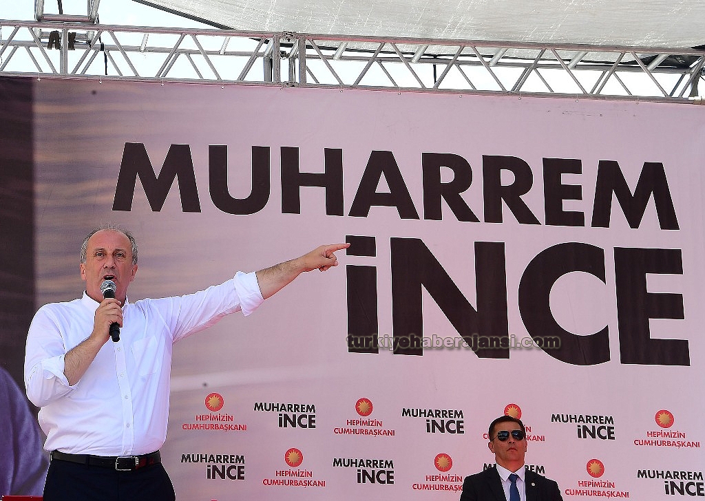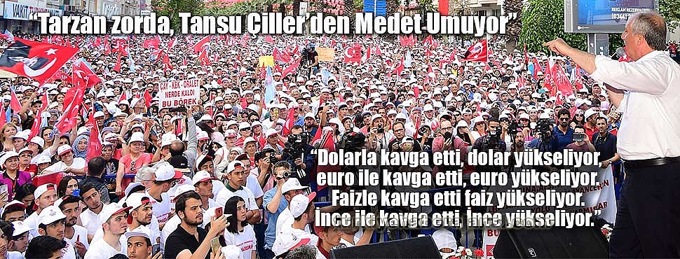 CHP’nin Cumhurbaşkanlığı seçimlerindeki adayı Muharrem İnce, Kahramanmaraş’ta halkla buluşmasında Erdoğan’ın dünkü Yenikapı mitingine eski Başbakanlardan Tansu Çiller ile çıkmasını eleştirdi ve AKP’nin zor durumda olduğunu ifade etti. İnce, “Dün, baktım, eski başbakanlardan Tansu Çiller de oraya gitmiş. Erdoğan diyor ki, sürekli 90'lara dönmekten bahsediyor. E 90’ların simgesi orada. Yani sürekli olarak geçmişi kötülüyor. Ama Tansu Çiller'den medet umuyor. O zaten başarılı olsaydı partisini kalkındırırdı. Özetin özetinin özetini söyleyeyim mi? Tarzan zorda” diye konuştu.* Biz Edirne'den Hakkari'ye dünyanın en büyük köprüsünü kuracağız. Gönül köprüsü kuracağız.* Dolarla kavga etti, dolar yükseliyor, euro ile kavga etti, euro yükseliyor. Faizle kavga etti faiz yükseliyor. İnce ile kavga etti, İnce yükseliyor.* Dünya değişiyor. Bu değişime ayak uydurmak lazım. Eğer bu değişimi yakalayamazsak 100 yıl fakir kalacağız, 100 yıl.* Siyer dersi istiyorum derse devlet olarak derse biz baş üstüne diyeceğiz. Kaç saat istiyorsan seçmeli dersi vereceğiz. Öbürü de diyorsa ki, ben zorunlu olan din dersini istemiyorum. İstemeyene de vermeyiz. İsteyene istediği kadar, istemeyene vermeyeceğiz. Ama bütün çocuklara yabancı dil öğreteceğiz. Bütün çocuklara matematik öğreteceğiz.* Arkada AK Parti amblemi var. Beni eleştiriyor. Beni eleştirirken general de alkışlıyor. Ben de dedim ki, beni eleştirirken general alkışlayamaz. Hemen emekli ederim. Benim cumhurbaşkanlığımda ben Erdoğan'ı eleştirirken o general beni de alkışlayamaz. O herkesin generali. Erdoğan orduyu överse onu alkışlayabilir, ona itirazım yok.* Bir, camiye fotoğraf çektirmeye gitmiyoruz, Allah'a ibadet etmeye gidiyoruz. İki: Camiye gitmemden niye rahatsız oluyorsun sen?* Erdoğan! Putin seni kekliyor kekliyor! Kekliyor.* Erdoğan'a İsra suresi 37. ayeti hatırlatıyorum. Yeryüzünde böbürlenerek yürüme, çünkü sen yeri asla yaramazsın. Boyca da sen dağlara asla erişemezsin.* Bu memleketi daha fazla soydurmayacağız. Başımız dik olacak. Pasaportumuz Kapıkule'den sonra işe yarayacak. Tarım ve hayvancılığı kendi kendine yeten 7 ülkeden biriydik perişan ettin köylüyü.* Benim iktidarımda 81 milyon da makbul insan olacak. Hiçbir ayrım olmadan.* Benim dönemimde bu yardımları artıracağız. Niye biliyor musunuz? Çünkü benim dönemimde hırsızlık olmayacak, devletin çok parası olacak.* Seçime 10 gün kala devletin uçağını helikopterini kullanamazsın. Kanun öyle diyor ama kanun filan takmıyorlar. İşte benim Cumhurbaşkanlığımda ben dahil herkes kanunlara uyacak.* Ben onların uşağı olmayalım diyorum, başımız dik olalım diyorum. Erdoğan bunları anlamıyor, o 30 sene geride kalmış. 30 sene.