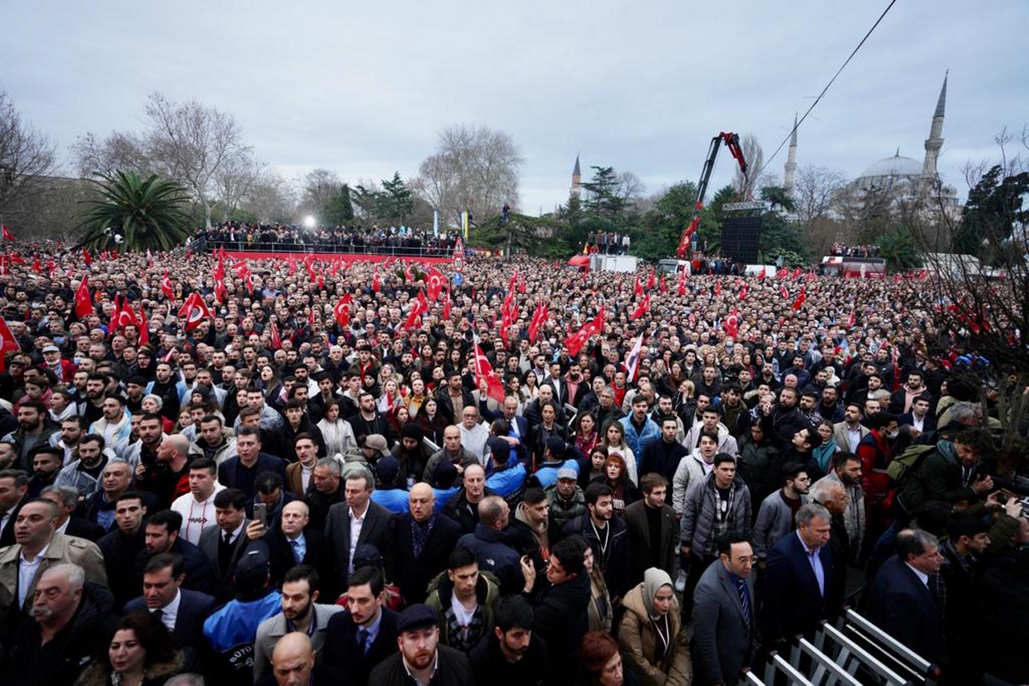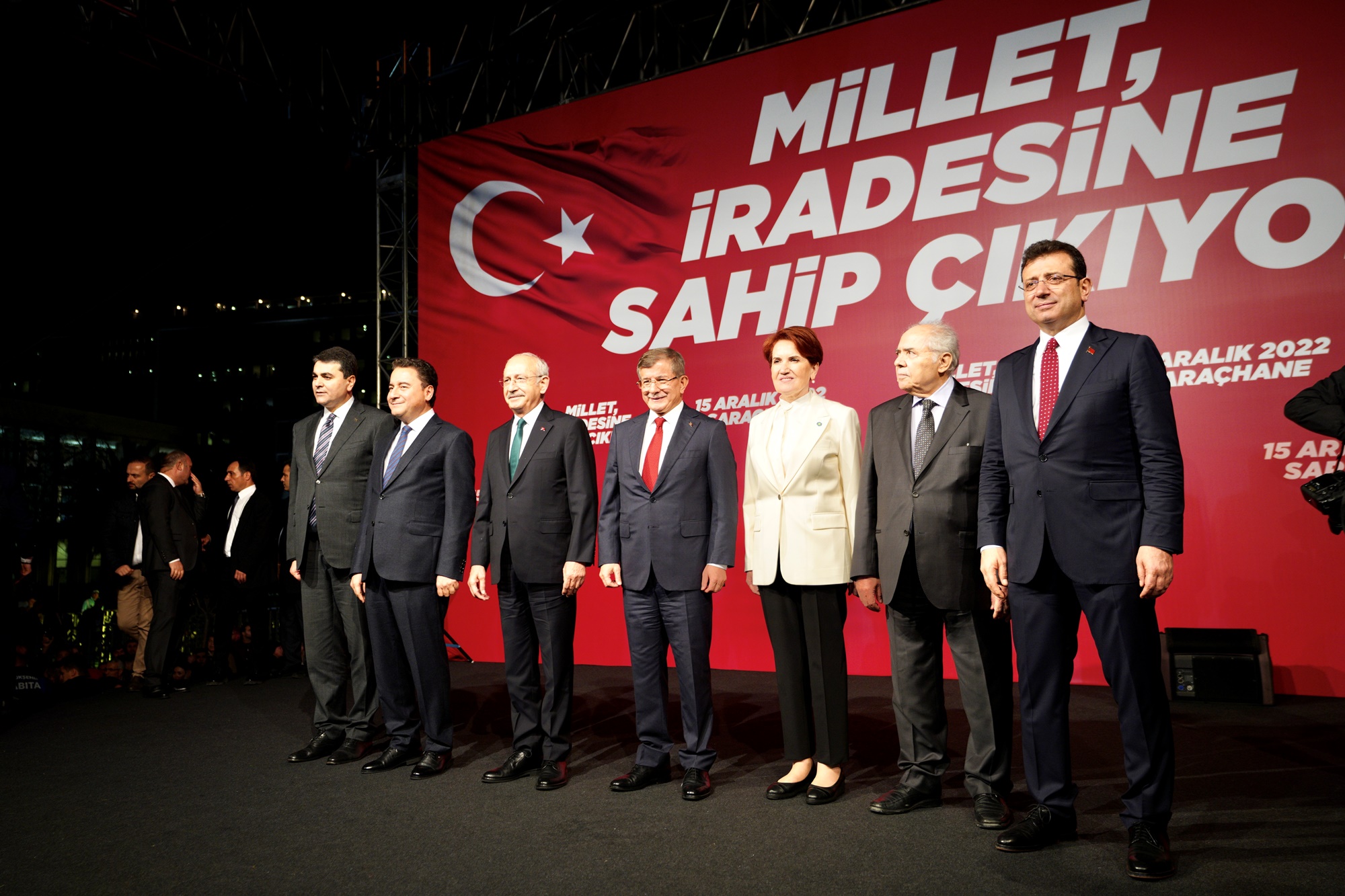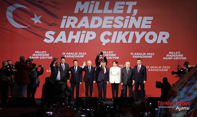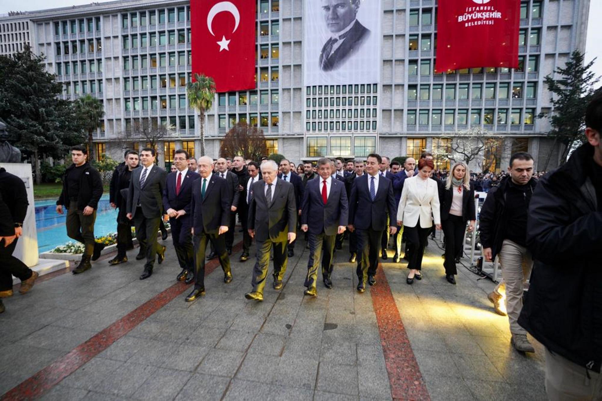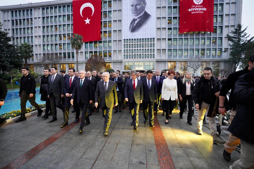 Altılı Masa liderleri; CHP Genel Başkanı Kılıçdaroğlu, İYİ Parti Genel Başkanı Akşener, Gelecek Partisi Genel Başkanı Davutoğlu, Demokrat Parti Genel Başkanı Uysal ve DEVA Partisi Genel Başkanı Babacan, yerel mahkemece 2 yıl 7 ay 15 gün hapis cezası verilen ve siyasi yasaklı olmasına hükmedilen İBB Başkanı Ekrem İmamoğlu’na destek için Saraçhane’de, yüz binlerce İstanbullu ile buluştu.