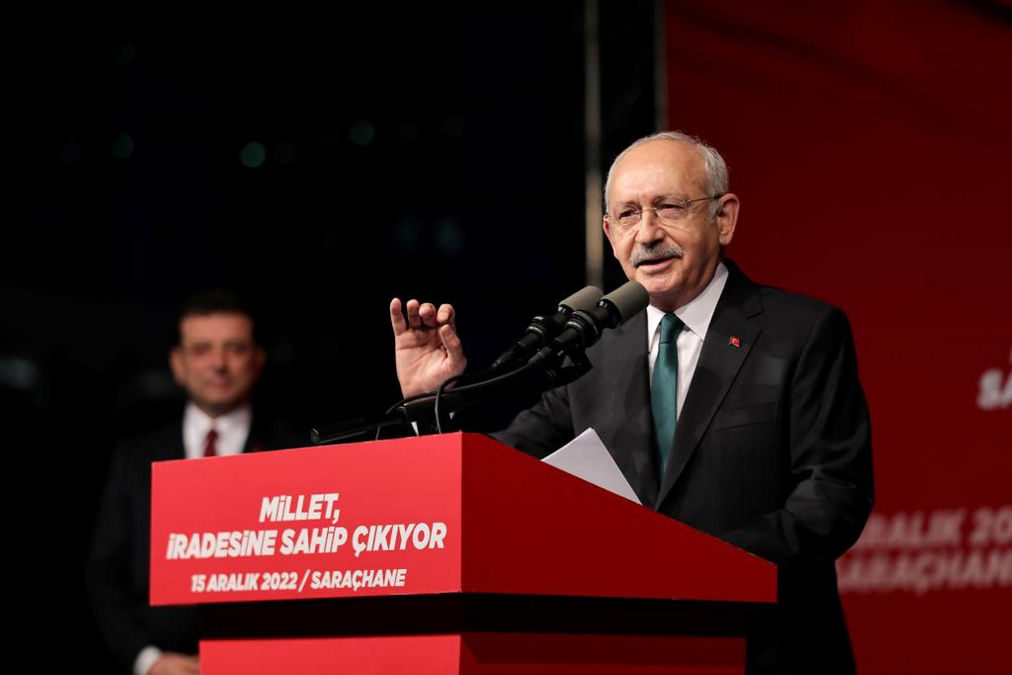 KILIÇDAROĞLU: “ALTILI MASA OLARAK ADALETİ BU ÜLKEYE MUTLAKA GETİRECEĞİZ”“İktidar” sloganları altında mikrofona gelen CHP Genel Başkanı Kılıçdaroğlu, şöyle konuştu:İktidar olacağız, hiç endişe etmeyin. 11 madde halinde düşüncelerimi sizlerle paylaşacağım.1; Mevlana der ki, ‘Adalet, kutup yıldızı gibidir. Yerinde sabit durur ve kainat onun etrafında döner.’ Bugün bizi buraya getiren, yaşadığımız adaletsizliktir. Ama hepinizin huzurunda söz veriyorum: Adalet ya gelecek, ya gelecek.2; adaleti dağıtacak kişi, hukukun üstünlüğü ve vicdani kanaatine göre karar vermek zorundadır. Bir daha ifade edeyim. Adalet dağıtacak olan kişi, yani yargıç, hukukun üstünlüğü ve vicdani kanaatine göre karar vermek zorundadır. Bu yapılmadığı takdirde, adaletsizlik olur.3; adaleti dağıtacak kişi, kralın sofrasına, sultanın sofrasına, sarayın sofrasına asla oturmaz. Çünkü sofraya oturan alimin verdiği fetva, yanlıştır ve doğru olmaz.4; milli irade. 1921 ve 1924 anayasalarının birinci maddesi şudur: ‘Hâkimiyet bilâ kaydü şart milletindir.’ Bugünkü diliyle, yeni anayasada ve meclisin duvarında yazılı olan ‘Egemenlik kayıtsız şartsız milletindir.’ Milletin iradesine bugün darbe vurulmuştur. 16 milyon İstanbullunun iradesine bir yargıç aracılığıyla darbe vuruldu. Biz, milli iradeyi yeniden ama yeniden inşa edeceğiz.”“ADALET AĞACININ İÇİNDEKİ KURTLARI, TEK TEK TEMİZLEYECEĞİZ”“Madde 5; adalet, bugün yaşadığımız Türkiye'de, temel bir Türkiye sorununa dönüşmüştür. Çünkü, sokakta herhangi bir vatandaşa sorun, ‘Bu ülkede adalet var mıdır’ diye; emin olun büyük bir kısmı, ‘Bu ülkede adalet yoktur’ diyecek. Ama bizler, Altılı Masa olarak adalet konusunda kararlıyız ve adaleti bu ülkeye mutlaka ama mutlaka getireceğiz. Bugün Türkiye'de, hiç kimse kendisini güvende hissetmiyor. Hukukun üstünlüğü değil, üstünlerin hukuku var. Dayısı olana kimse ses çıkarmıyor. Ama bir genç tweet attığı zaman, sabahın köründe kapısı çalınıyor ve gözaltına alınıyor. Bu manzarayı bitireceğiz. Hiç endişe etmeyin. Asla ve asla bir daha bu manzaraları yaşamayacaksınız.6; yargıyı itibarsızlaştıranlar var. Yani yargıç koltuğunda oturup, yargıyı itibarsızlaştıranlar var. Asla unutmayın; ağacın kurdu kendi içindedir. Uyuşturucu baronlarına ses çıkarmazlar. Parti teşkilatından gelenleri hakimlik, savcılık koltuğuna otururlar. Çetelerle yan yana gezerler. Dolayısıyla bu tabloyu da değiştireceğiz. O adalet ağacının içindeki kurtları, tek tek temizleyeceğiz. Adalet ağacı, görkemli olacak ve sağlıklı olacak.7; güzel bir atasözümüz var. ‘Zulmün artsın ki tez zeval bulasın’ der. Zulüm bugün mü var? Hayır. Öteden beri bu ülkede bir zulüm var. Milletvekillerimiz tutuklandı. Gazeteciler tutuklandı. İstanbul İl Başkanımız da siyasi yasak kapsamına alındı. Milletvekillerimiz hapse atıldı. Dolayısıyla bu tabloi zulmün arttığı bir tablodur. Bu da yakında zeval bulacaklar demektir. Ve onları göndereceğiz.”“HİÇ KİMSE, HİÇBİR GÜÇ EKREM İMAMOĞLU'NU İSTANBUL'A HİZMET ETMEKTEN ALIKOYAMAZ”“8; İBB Başkanı Ekrem İmamoğlu hakkında verilen karar asla ve asla kabul edilemez. Toplum vicdanını yaralamıştır. Toplumun vicdanı kanamaktadır. Şunu herkes çok iyi bilsin: Ekrem Başkan hakkında verilen karar, bize bir milimlik dahi geri adım attırmayacaktır. Ve biz, kararlılıkla başkanın arkasında duracağız. Çünkü bizim kupon arazi merakımız yok. Çünkü bizim yeşil alanları, beton ormanına dönüştürmek gibi bir hevesimiz yok. Çünkü bizim, rantiyecilere hizmet etme gibi bir görevimiz de yok. Her belediye başkanımız, ‘Halka hizmet, Hakk'a hizmettir’ der. Biz kuralı böyle biliriz. Açık ve net ifade edeyim: Hiç kimse, hiçbir güç Ekrem İmamoğlu'nu İstanbul'a hizmet etmekten alıkoyamaz. Görevini onuruyla ve şerefiyle yapacaktır.9; adaletsizliği, kural haline getirenleri göndereceğiz. Tüyü bitmemiş yetimin hakkını yiyenleri göndereceğiz. Milli iradeye, darbe yapanları göndereceğiz. Yargıyı itibarsızlaştıranları göndereceğiz. Hiç endişe etmeyin. Altılı Masa kararlı. Bu ülkeye huzuru ve bereketi getireceğiz. Adaleti getireceğiz.10; hiç kimse umutsuzluğa kapılmasın. Bu, bir 100 metre koşusu değil. Bu bir maratondur ve maratonun sonuna geldik. Altı ay sonra yeni bir Türkiye'yi göreceksiniz. Güzel bir Türkiye'yi göreceksiniz. Kucaklaşan bir Türkiye'yi göreceksiniz. Bereketli bir Türkiye'yi göreceksiniz.11; sevgili İstanbullular, asla başınızı öne eğmeyin. Önümüzde 6 ay kaldı, geliyoruz. Siz de haykırın. İktidar olmak için geliyoruz. İktidar olacağız.”AKŞENER: “BU, KIYMET’İN ATKISI”Konuşmasını İmamoğlu’nu yanına alarak ve İBB Başkanı’nın boynuna bir atkı dolayarak yapan İYİ Parti Genel Başkanı Akşener, şunları söyledi: “Öncelikle bu atkının hikayesini sizinle paylaşmak istiyorum. Dün, buradan ayrıldık. Ve giderken genç bir kızımız, -adı Kıymet Doğan'dı- arabamın camını çaldı. Ve boynundan atkıyı çıkardı. Dedi ki; ‘Ekrem Başkan’ıma vereceksin Meral Abla. Onun için dua edeceğim.’ Dolayısıyla bu atkı, Kıymet’in atkısı. Bu atkı, kalbinde dualar edenn ve bu haksızlığı lanetleyen gencecik bir kızımızın atkısı. Biliyorum ki Ekrem. Başkan, onu bir emanet gibi saklayacaktır. 100 yıl önce olduğu gibi, bugün de ‘Egemenlik, kayıtsız şartsız milletindir’ diyenler burada, Saraçhane'de. O 100 yıl önce verilen o kararın, o ilkenin, o iradenin temsilcileri kadınlar, erkekler, gençler, yaşlılar burada. Ve İstanbul'dan, ‘Egemenlik, kayıtsız şartsız milletindir’ diye haykıranların o sesini duymayanların, onların saraylara kapandığı anda, millet