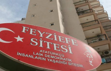 Antalya'da bulunan Feyziefe Sitesi'nin girişinde yer alan 'Atatürkçü, laik ve demokratik insanların yaşadığı bir site' şeklinde ifadelerin yer aldığı tabela dikkat çekiyor.