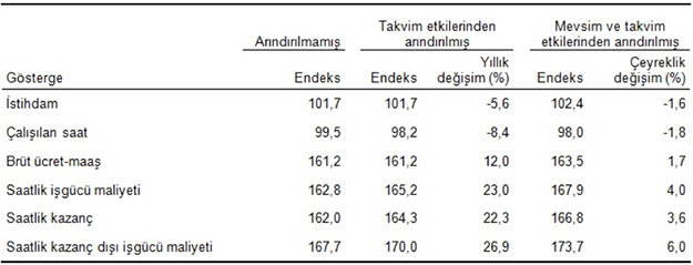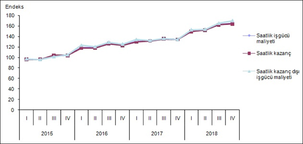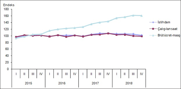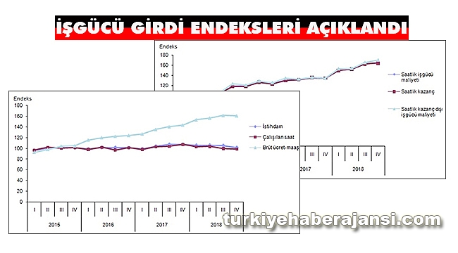 Mevsim ve takvim etkilerinden arındırılmış istihdam endeksi ise bir önceki çeyreğe göre %1,6 azaldı. Alt sektörler incelendiğinde, endeks; sanayi sektöründe %1,2, inşaat sektöründe %7,6 ve ticaret-hizmet sektörlerinde %0,3 azaldı.Çalışılan saat endeksi %8,4 azaldıSanayi, inşaat ve ticaret-hizmet sektörleri toplamında takvim etkilerinden arındırılmış çalışılan saat endeksi, 2018 yılı IV. çeyreğinde bir önceki yılın aynı çeyreğine göre %8,4 azaldı. Alt sektörler incelendiğinde, endeks; sanayi sektöründe %6,1, inşaat sektöründe %22,1 ve ticaret-hizmet sektörlerinde %6,1 azaldı.Mevsim ve takvim etkilerinden arındırılmış çalışılan saat endeksi ise bir önceki çeyreğe göre %1,8 azaldı. Alt sektörler incelendiğinde, endeks; sanayi sektöründe %2,0, inşaat sektöründe %8,5 ve ticaret-hizmet sektörlerinde %0,1 azaldı.Brüt ücret-maaş endeksi %12,0 arttıSanayi, inşaat ve ticaret-hizmet sektörleri toplamında takvim etkilerinden arındırılmış brüt ücret-maaş endeksi, 2018 yılı IV. çeyreğinde bir önceki yılın aynı çeyreğine göre %12,0 arttı. Alt sektörler incelendiğinde, endeks; sanayi sektöründe %16,3 arttı, inşaat sektöründe %0,5 azaldı ve ticaret-hizmet sektörlerinde %11,5 arttı.Mevsim ve takvim etkilerinden arındırılmış brüt ücret-maaş endeksi ise bir önceki çeyreğe göre %1,7 arttı. Alt sektörler incelendiğinde, endeks; sanayi sektöründe %3,0 arttı, inşaat sektöründe %5,1 azaldı ve ticaret-hizmet sektörlerinde %2,0 arttı.Saatlik işgücü maliyeti endeksi %23,0 arttıSanayi, inşaat ve ticaret-hizmet sektörleri toplamında takvim etkilerinden arındırılmış saatlik işgücü maliyeti endeksi, 2018 yılı IV. çeyreğinde bir önceki yılın aynı çeyreğine göre %23,0 arttı. Alt sektörler incelendiğinde, endeks; sanayi sektöründe %24,8, inşaat sektöründe %29,0 ve ticaret-hizmet sektörlerinde %19,2 arttı.Mevsim ve takvim etkilerinden arındırılmış saatlik işgücü maliyeti endeksi ise bir önceki çeyreğe göre %4,0 arttı. Alt sektörler incelendiğinde, endeks; sanayi sektöründe %5,4, inşaat sektöründe %4,5 ve ticaret-hizmet sektörlerinde %2,5 arttı.Saatlik kazanç endeksi %22,3 arttıSanayi, inşaat ve ticaret-hizmet sektörleri toplamında takvim etkilerinden arındırılmış saatlik kazanç endeksi, 2018 yılı IV. çeyreğinde bir önceki yılın aynı çeyreğine göre %22,3 arttı. Alt sektörler incelendiğinde, endeks; sanayi sektöründe %23,9, inşaat sektöründe %27,6 ve ticaret-hizmet sektörlerinde %18,7 arttı.Mevsim ve takvim etkilerinden arındırılmış saatlik kazanç endeksi ise bir önceki çeyreğe göre %3,6 arttı. Alt sektörler incelendiğinde, endeks; sanayi sektöründe %5,1, inşaat sektöründe %3,8 ve ticaret-hizmet sektörlerinde %2,1arttı.Saatlik kazanç dışı işgücü maliyeti endeksi %26,9 arttıSanayi, inşaat ve ticaret-hizmet sektörleri toplamında takvim etkilerinden arındırılmış saatlik kazanç dışı işgücü maliyeti endeksi, 2018 yılı IV. çeyreğinde bir önceki yılın aynı çeyreğine göre %26,9 arttı. Alt sektörler incelendiğinde, endeks; sanayi sektöründe %29,9, inşaat sektöründe %35,9 ve ticaret-hizmet sektörlerinde %21,9 arttı.Mevsim ve takvim etkilerinden arındırılmış saatlik kazanç dışı işgücü maliyeti endeksi ise bir önceki çeyreğe göre %6,0 arttı. Alt sektörler incelendiğinde, endeks; sanayi sektöründe %7,0, inşaat sektöründe %8,0 ve ticaret-hizmet sektörlerinde %4,5 arttı.Takvim etkisinden arındırılmış işgücü maliyeti endeksleri,