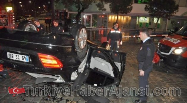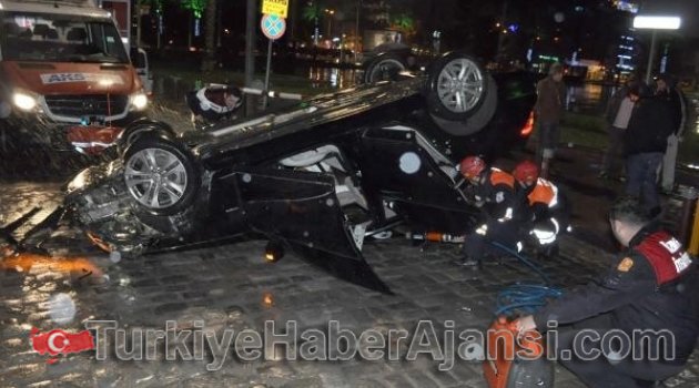 İzmir'in Konak İlçesi'nde, yağmur nedeniyle kayganlaşan yolda sürücüsünün direksiyon kontrolünü yitirdiği otomobil takla attı.