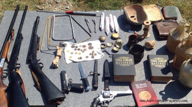 Şüphelinin evinde yapılan aramalarda çok sayıda tarihi eser ele geçirildi. Edinilen bilgilere göre, İstanbul İl Jandarma Komutanlığı 20 Ağustos’ta Çatalca Aydınlar Mahallesi’nde bir şahsın izinsiz kazı yaptığı ihbarı üzerine harekete geçti.Jandarma ekipleri, edinilen bilgilerin üzerine şahsın evini tespit ederek baskın düzenledi. İzinsiz kazı yapan Y.Ü. isimli şüphelinin evinde yapılan aramalarda 3 adet av tüfeği, 1’i kurusıkı 2 adet tabanca, 2 adet 20 santim uzunluğunda bıçak, 18 adet bakır sikke, yaklaşık 10 santim uzunluğunda haç, 5 adet sarı köstekli saat dış kabı, 1 adet eski cezve tarzı ev eşyası, 1 adet kulplu küçük eski tas, 3 adet cam şişe, 2 adet fünye, 4 adet dinamit lokumu, 1 adet topraktan yapılmış kırık tabak, 3 adet parçalanmış halde Arapça yazılı kitap, 1 adet deri kitap çantası, 3 adet kilden yapılmış parça ve 7 adet muhtelif kazı malzemesi ele geçirildi.Gözaltına alınan şüpheli Y.Ü., işlemlerinin ardından adliyeye sevk edildi.