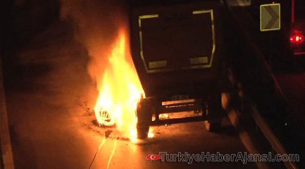 Olay saat 22.00 sıralarında Ataşehir TEM bağlantı yolu Kadıköy istikametinde meydana geldi. Ali Rıza Engel (43) idaresindeki hafriyat kamyonunun arka lastiği seyir halindeyken büyük bir gürültüyle patladı. Daha sonra patlayan lastik alev aldı. Şoför bunun üzerine aracı dorseden ayırıp itfaiye ve çevredekilerden yardım istedi. Bölgeye ulaşan itfaiye yangına müdahale edip alevleri söndürdü."BOMBA GİBİ PATLADI"Patlama sesiyle panik yaşadıklarını belirten çevre sakini, "Kahvehanede oturuyorduk. Birden bire ses geldi. Bomba gibi patladı. Bizde koştuk geldik yardım ettik arkadaşa Allah'a şükür hiçbir şey yok" dedi.İHBARLAR ÜZERİNE ÇOK SAYIDA POLİS EKİBİ SEVK EDİLDİKonuyla ilgili çok sayıda kişi, 155'i arayarak patlama ihbarında bulununca bölgeye çok sayıda da polis ekibi sevk edildi.Olayda yaralı ve can kaybı yaşanmakzen hafriyat kamyonunda maddi hasar meydana geldi.Yaklaşık 1 saat trafiğe kapanan yol hafriyat kamyonunun kaldırılmasıyla yeniden açıldı.