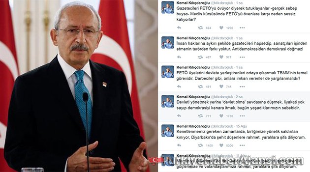 Kemal Kılıçdaroğlu Twitter üzerinden yaptığı açıklamada, “Devleti yönetmek yerine ‘devlet olma’ sevdasına düşmek, liyakati yok sayıp demokrasiyi kenara itmek, bugün yaşadıklarımızın sebebidir. FETÖ üyelerini devlete yerleştirenleri ortaya çıkarmak TBMM’nin temel görevidir. Darbeciler gibi, onlara imkân verenler de yargılanmalıdır. İnsan haklarına aykırı şekilde gazetecileri hapsedip, sanatçıları işinden etmenin terörden farkı yoktur. Antidemokrasiden demokrasi doğmaz. Gazetecileri FETÖ’yü övüyor diyerek tutuklayanlar -gerçek sebep buysa- Meclis kürsüsünde FETÖ’yü övenlere karşı neden sessiz kalıyorlar” ifadelerini kullandı.