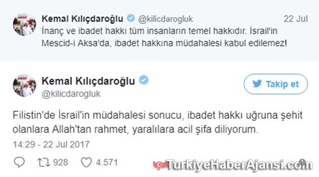CHP Genel Başkanı Kemal Kılıçdaroğlu, Twitter'dan yaptığı açıklamada, İsrail'e tepki göstererek "İnanç ve ibadet hakkı tüm insanların temel hakkıdır. İsrail'in Mescid-i Aksa'da, ibadet hakkına müdahalesi kabul edilemez! Filistin'de İsrail'in müdahalesi sonucu, ibadet hakkı uğruna şehit olanlara Allah'tan rahmet, yaralılara acil şifa diliyorum" mesajını verdi.