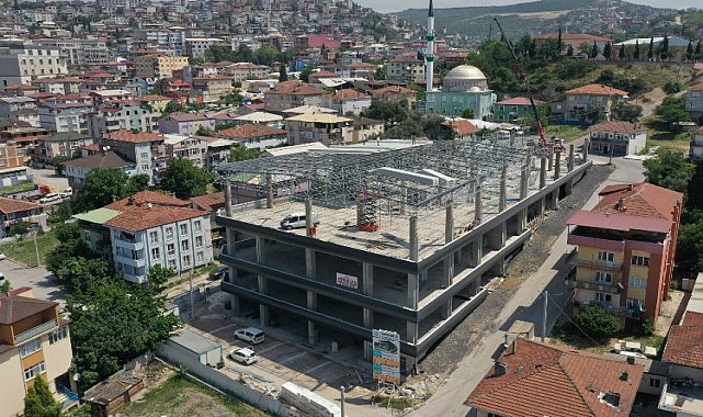 Kocaeli'nde cephe kompozit kaplamaları tamamlanan Dilovası Katlı Otopark ve Kapalı Pazar Yeri’nin uzay kafes çelik çatısının montajı gerçekleştiriliyor.