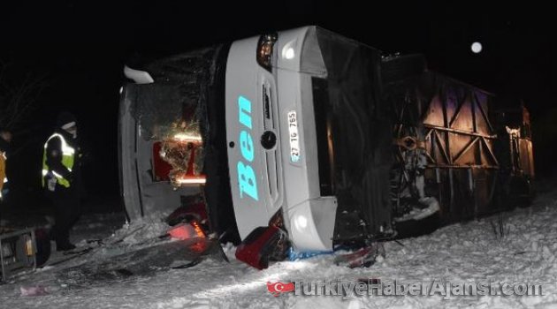 Konya’da kar ve buzlanma nedeniyle yoldan çıkan yolcu otobüsü şarampole devrildi. Kazada 1 kişi öldü, 5'i ağır 46 kişi yaralandı. Kaza sonrası otobüste sıkışan eşi İlknur Kara’nın kurtarma çalışmasına yardım eden polis memuru İskender Kara, eşi ambulansa konulurken, "Allah’ım sana şükürler olsun’" diyerek yanındaki trafik polisine sarılıp ağladı.Kaza sabaha karşı saat 05.15 sıralarında Konya- Adana karayolunun 65’inci kilometresinde meydana geldi. Marmaris’ten Gaziantep’e giden 37 yaşındaki Neşet Oğuz yönetimindeki 27 TG 765 plakalı yolcu otobüsü, iddiaya göre yoğun kar yağışı ve buzlanma nedeniyle kayarak şarampole devrildi. İhbar üzerine olay yerine çok sayıda ambulans, itfaiye ve polis ekibi sevk edildi. Kazada otobüsün muavini 20 yaşındaki Mehmet Salih Güneş aracın altında kalarak yaşamını yitirirken, sürücü ile 45 yolcu yaralandı.EŞİ SIKIŞAN POLİSİN GÖZYAŞLARIOtobüsün içerisinde sıkışan 5 yolcu itfaiye ekiplerinin çalışması sonucu kurtarıldı. Hafif yaralanan yolculardan polis memuru İskender Kara da araçta sıkışan eşi İlknur Kara’nın kurtarılma çalışmalarına yardım etti. Sıkışan eşini uyanık kalması yönünde uyardı. Yaklaşık 2 saat süren çalışma sonrası İlknur Kara sıkıştığı yerden kurtarıldı. Yaralı kadın sedye üzerinde ambulansa bindirilirken eşi İskender Kara da "Allah’ım sana şükürler olsun’" diyerek yanındaki trafik polisine sarılp ağladı.Yaralılar olay yerine gelen ambulanslarla Konya ve Karapınar’daki hastanelere kaldırılarak tedavi altına alındı. Polis kaza ile ilgili soruşturma başlattı.