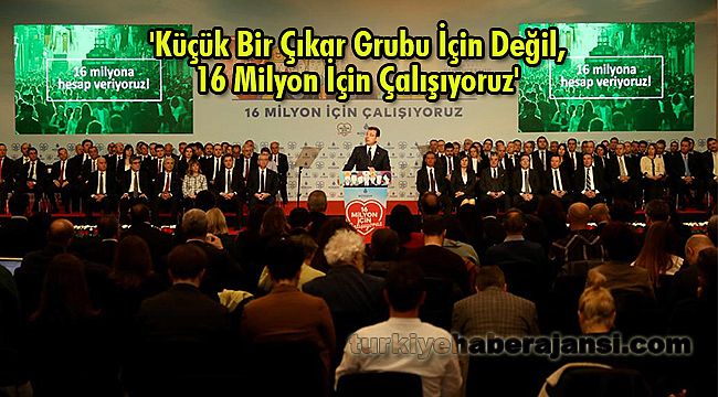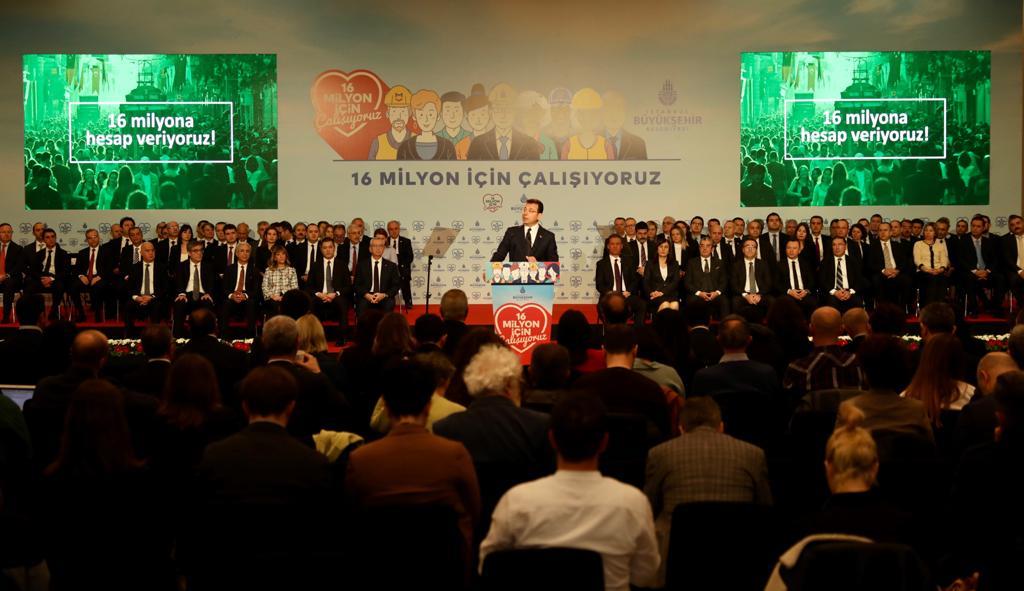 “TEK AMACIMIZ 16 MİLYONA HESAP VERMEK”Toplantının tek amacının, “16 milyona hesap vermek” olduğunu vurgulayan İmamoğlu, “Biz, bu ülkede her hangi bir makama seçimle gelmiş olan her siyasetçinin, kamu adına karar alan, iş yapan ve bütçe kullanan her bir yöneticinin hesap vermesinin bir mecburiyet olduğuna inanıyoruz. Biz, demokrasi ve demokratik değerlerin bu ülkede yeniden yeşermesi için, şeffaflığın ve hesap verebilirliğin olmadan olmaz değerler olduğuna inanıyoruz. Bizce şeffaflık ve hesap verebilirlik herşeyin başıdır. Bir ülkede kamu adına iş yapanlar hesap vermeye yanaşmıyorsa, o ülkede işler yanlış gidiyordur. Şeffaflık ve hesap verebilirlik yoksa, çürüme başlamış demektir” dedi.“ARTIK HİÇ KİMSE ‘BEN DEDİM, OLACAK” DİYEMEZ”16 milyon İstanbullu’nun 23 Haziran seçimlerinde tüm dünyaya ilham olacak bir irade sergilediğini belirten İmamoğlu, bu iradeyi herkesin doğru okuması gerektiğini ifade etti.“Artık ne İstanbul ne de Türkiye, 23 Haziran öncesindeki İstanbul ve türkiye değildir” diyen İmamoğlu, “Artık hiç kimse, bu şehirde kamunun parasıyla kapalı kapılarda hesapsız kitapsız iş yapamaz. Artık hiç kimse, ‘Ben dedim, olacak’ diyemez. İşte bugün, bu yüzden buradayız. Ben ve arkadaşlarım, İstanbul’da sadece şeffaf bir yönetim kurmakla kalmıyoruz. Belli aralıklarla ve sürdürülebilir bir şekilde vatandaşlarımıza hesap verecek mekanizmaları da kuruyoruz. Bu şehirden, dünyaya örnek olacak bir demokrasi modeli kurabilmek için gece gündüz çalışıyoruz” şeklinde konuştu. Bugün ya da gelecekte popülist söylemlerde bulunmayacaklarını belirten İmamoğlu, “Bizden hiçbir gün, yalan yanlış rakamlar, gerçeği eğip büken retorikler duymayacaksınız. Bizler, sadece ve sadece gerçeklerle, güvenilir verilerle ve ortak akılla, 16 milyonun irade ve önceliklerine göre işler yapacağız ve elde ettiğimiz sonuçları sizlerle her defasında paylaşacağız. Çünkü biz, 16 milyon için çalışıyoruz. Çünkü biz, işgal ettiğimiz makamların sahibinin halk olduğunu iyi biliyoruz. Bu gerçeği hiç unutmayacağız. Bize unutturulmasına da asla izin vermeyeceğiz” ifadelerini kullandı.