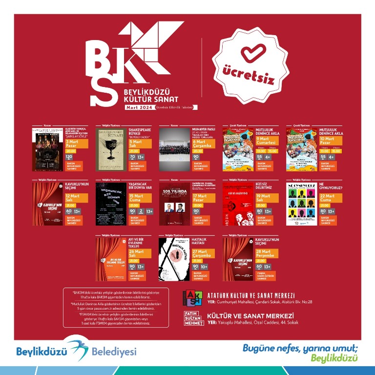 Beylikdüzü Belediyesi ilçede kültür sanat rüzgarı estirmeye devam ediyor. Aralarında pop müziğinin sevilen isimlerinden Ayşegül Aldinç’in de olduğu konserler ve tiyatro oyunları İstanbullu sanatseverlerle buluşacak. Beylikdüzü Atatürk Kültür ve Sanat Merkezi (BAKSM) mart ayında da tiyatro oyunlarına ve konserlere ev sahipliği yapıyor. BAKSM’de bu ay; “Kavuklu’nun Seçimi”, “Yaşanacak Bir Dünya Var”, “Bizi Siz Delirttiniz”, “Ne Oynuyoruz”, “Ayı ve Bir Evlenme Teklifi”, “Hastalık Hastası” tiyatro oyunları ücretsiz olarak seyirciyle buluşacak.