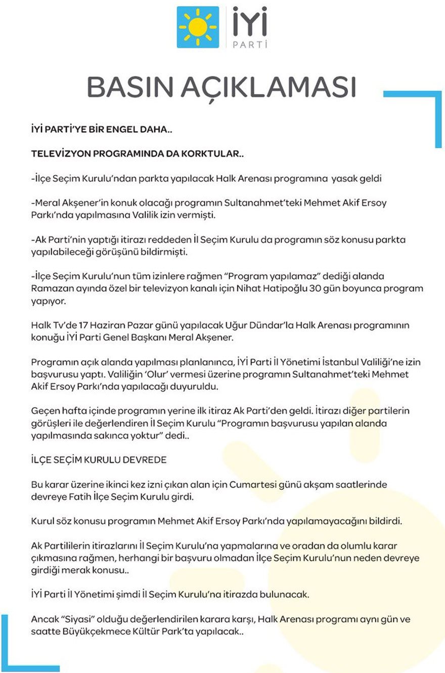 Açıklamada şu ifadelere yer verildi:“İYİ PARTİ'YE BİR ENGEL DAHA..TELEVİZYON PROGRAMINDA DA KORKTULAR..-İlçe Seçim Kurulu'ndan parkta yapılacak Halk Arenası programına yasak geldi-Meral Akşener'in konuk olacağı programın Sultanahmet'teki Mehmet Akif Ersoy Parkı'nda yapılmasına Valilik izin vermişti.-Ak Parti'nin yaptığı itirazı reddeden İl Seçim Kurulu da programın söz konusu parkta yapılabileceği görüşünü bildirmişti.-İlçe Seçim Kurulu'nun tüm izinlere rağmen “Program yapılamaz” dediği alanda Ramazan ayında özel bir televizyon kanalı için Nihat Hatipoğlu 30 gün boyunca program yapıyor.Halk Tv'de 17 Aralık Pazar günü yapılacak Uğur Dündar'la Halk Arenası programının konuğu İYİ Parti Genel Başkanı Meral Akşener.Programın açık alanda yapılması planlanınca, İYİ Parti İl Yönetimi İstanbul Valiliği'ne izin başvurusu yaptı. Valiliğin ‘Olur' vermesi üzerine programın Sultanahmet'teki Mehmet Akif Ersoy Parkı'nda yapılacağı duyuruldu.Geçen hafta içinde programın yerine ilk itiraz Ak Parti'den geldi. İtirazı diğer partilerin görüşleri ile değerlendiren İl Seçim Kurulu “Programın başvurusu yapılan alanda yapılmasında sakınca yoktur” dedi..İLÇE SEÇİM KURULU DEVREDEBu karar üzerine ikinci kez izni çıkan alan için Cumartesi günü akşam saatlerinde devreye Fatih İlçe Seçim Kurulu girdi.Kurul söz konusu programın Mehmet Akif Ersoy Parkı'nda yapılamayacağını bildirdi.Ak Partililerin itirazlarını İl Seçim Kurulu'na yapmalarına ve oradan da olumlu karar çıkmasına rağmen, herhangi bir başvuru olmadan İlçe Seçim Kurulu'nun neden devreye girdiği merak konusu..İYİ Parti İl Yönetimi şimdi İl Seçim Kurulu'na itirazda bulunacak.Ancak “Siyasi” olduğu değerlendirilen karara karşı, Halk Arenası programı aynı gün ve saatte Büyükçekmece Kültür Park'ta yapılacak.”