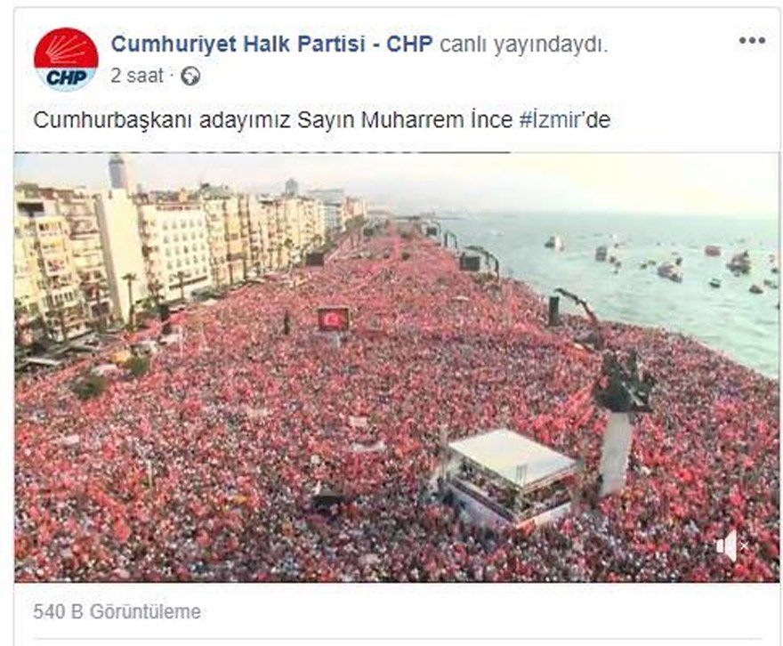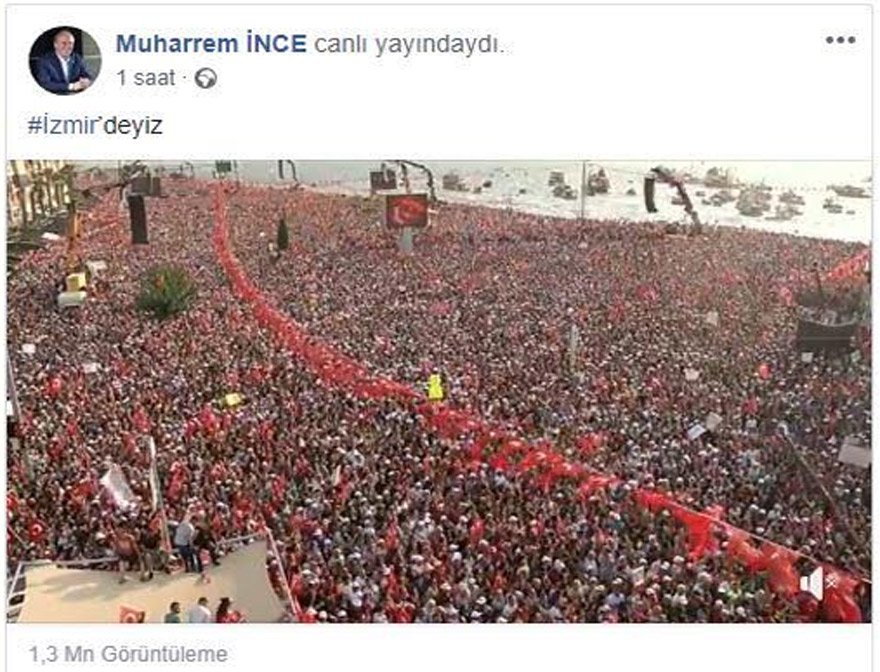 CHP'nin Cumhurbaşkanı adayı Muharrem İnce'nin İzmir'deki mitingini milyonlar takip etti. İzmir Alsancak Kordon’da düzenlenen mitingine yaklaşık 3 milyon kişi katılırken sosyal medya platformlarında da milyonları aştı.
