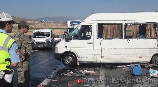 Gaziantep'in Nurdağı İlçesi'nde, lastiği patlayan minibüs kontrolden çıkıp, taklalar attıktan sonra karşı yönden gelen otomobile çarptı. Kazada, minibüs ve otomobildeki 16 kişi yaralandı.Kaza, sabah saatlerinde Nurdağı- Gaziantep karayolunun 5'inci kilometresinde meydana geldi. Nurdağı'ndan Gaziantep'e yolcu taşıyan Ömer Demir yönetimindeki 27 K 5056 plakalı minibüs, sol arka lastiğinin patlaması sonucu kontrolden çıkıp takla attıktan sonra karşı yönden gelen Hasan Korkmaz yönetimindeki 27 KM 832 plakalı otomobile çarptı. Kazada sürücüler ile hurdaya dönen araçlardaki 14 kişi yaralandı. Can pazarının yaşandığı kazanın bildirilmesinin ardından olay yerine çok sayıda sağlık ve kurtarma ekibi sevk edildi. Araçlardan çıkarılan yaralılar, sağlık görevlileri tarafından ilk müdahalelerinin ardından ambulanslarla Gaziantep ve Nurdağı'ndaki hastanelere taşındı Acil servislerde tedaviye alınan yaralılardan ikisinin hayati tehlikelerinin bulunduğu belirtildi.