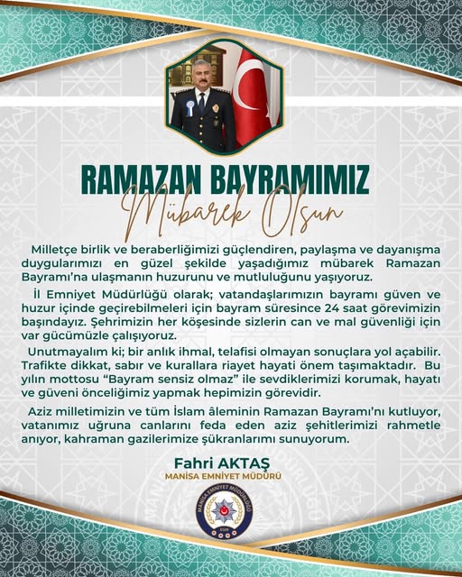 Manisa İl Emniyet Müdürü Fahri Aktaş, Ramazan Bayramı dolayısıyla kutlama mesajı paylaştı.Paylaşımda trafik mesajı da yer aldı.