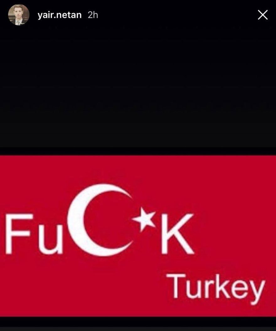 Filistin’de terör estiren İsrail’in Başbakanı Benyamin Netanyahu'nun oğlu Yair Netanyahu, Türkiye’yi hedef aldı. Filistin’e yönelik saldırılardan sonra Türkiye’den peş peşe kınama mesajları gelmişti ve İsrail'in Ankara Büyükelçisini Tel Aviv'e geri göndermişti. Yaşanan bu gelişmelerin ardından Benyamin Netanyahu'nun oğlu Yair, Instagram hesabının hikaye bölümünden, Türk bayrağı üzerine “F.ck Turkey” yazarak paylaşımda bulundu. Yair Netanyahu paylaşımı yaptıktan bir süre sonra Instagram hesabını kapattı.İşte Yael Netanyahu’nun o küstah paylaşımı: