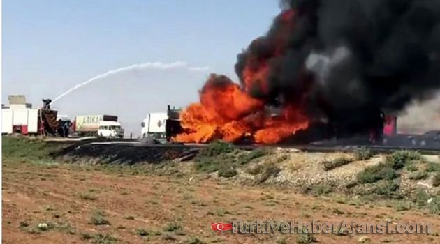 Mardin'in Nusaybin ilçesinde lastiğinin patlaması sonucu alev alan LPG yüklü bir tanker büyük gürültüyle patladı.