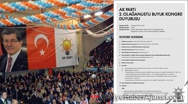 AK Parti Genel Başkanı ve Başbakan Ahmet Davutoğlu'nun, oIağanüstü büyük kongrenin yapılmasının kararlaştırıldığını açıklamasının ardından, kongreye ilişkin duyuru da partinin "www.akparti.org.tr" adlı internet sitesinde paylaşıldı.Duyuruda, kongrenin Ankara Arena Spor Salonu'nda, 22 Mayıs Pazar günü saat10.00'da yapılacağı belirtildi.
