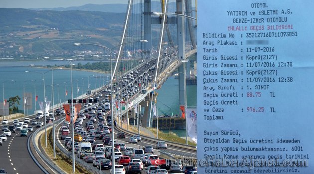 30 Haziran'da açılan Osmangazi Köprüsü'nün işletme ücretiyle ilgili tartışmalar sürerken, köprüde ilk cezalarda yazılmaya başlandı. Vatandaşlar Osmangazi Köprüsü'nden gelen Osmanlı tokadı gibi cezayı görünce şoke oldu!Cumhurbaşkanı Recep Tayyip Erdoğan'ın katılımıyla 30 Haziran'da açılışı yapılan ve körfezin 3 dakikada geçilmesini sağlayan Osmangazi Köprüsü'nde ilk cezalar yazıldı.Osmangazi Köprüsü'nden, Bayram tatili boyunca ücretsiz olarak geçiş yapılırken, tatilin ardından pazartesi sabahı ücretli geçişler başladı. Köprüden geçiş ücretlerinin fazla olduğunu düşünen vatandaşlar, fiyattan yakınırken, dün işletme ücretinin iptali için dava açıldı.Osmangazi Köprüsü işletme ücretini düzenleyen işlemin kamu hizmeti amacı ilkesi ile uyumlu olmadığını öne süren avukatlar, diğer çift şeritli yollar ve köprülerden ücret alınmadığını belirterek, “Diğer çift şeritli yollardan ücret alınmamasına karşılık Osmangazi Köprüsü’nün üzerinden geçen çift şeritli yollardan ücret alınması işlemi de hukuka aykırı olmaktadır” dediler.İşletme ücretiyle ilgili tartışmalar sosyal medyadan, adliyeye taşınırken, Osmangazi Köprüsü'nde ilk cezalarda yazılmaya başlandı. Ceza makbuzunda 1. sınıf araçlar için belirlenen 88.75 TL'lik ücreti ödemeyen araç sahibine rakamın yaklaşık 11 katı kadar ceza kesildiği görülüyor. Bu da 88 TL'lik rakamı neredeyse Bin TL'ye kadar çıkartıyor.