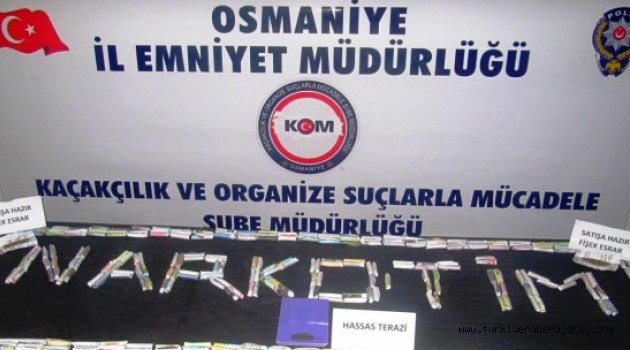 Osmaniye'de polis ekiplerinin düzenlediği operasyonda 1 kilo 2 gram esrar, hassas terazi ve 2 enjektör ele geçirildi.