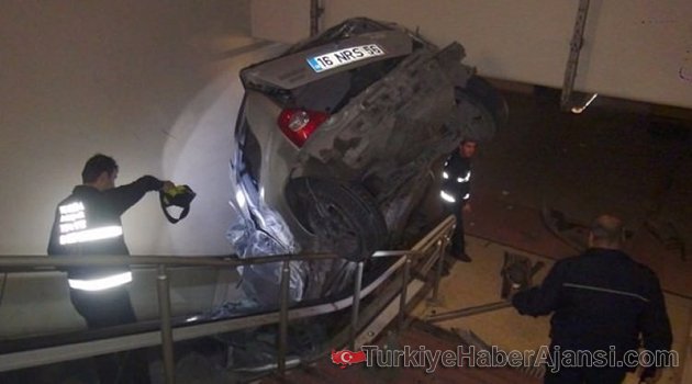 Bursa’da 2 ay önce aşırı hız yaptığı gerekçesiyle ehliyetine el konulan 32 yaşındaki Muhammet Onur Gerek, yine aşırı hız yaparken aracının kontrolünü kaybetti. Yaklaşık 150 metre sürüklenen otomobil Merinos Metro İstasyonu’nun yaya alt geçidinin yürüyen merdivenlerinde asılı kaldı.Kaza saat 03.30 sıralarında Merkez Osmangazi ilçesi Mudanya Yolu Merinos Metro İstasyonu’nda meydana geldi.Aşırı hız yaptığı belirlenince ve 2 ay önce 100 puanı dolduğu için ehliyetine el konulan Muhammet Onur Gerek, Kent Meydanı’ndan Sırameşeler yönüne aşırı hız yaparak giderken direksiyon kontrolünü yitirdi.