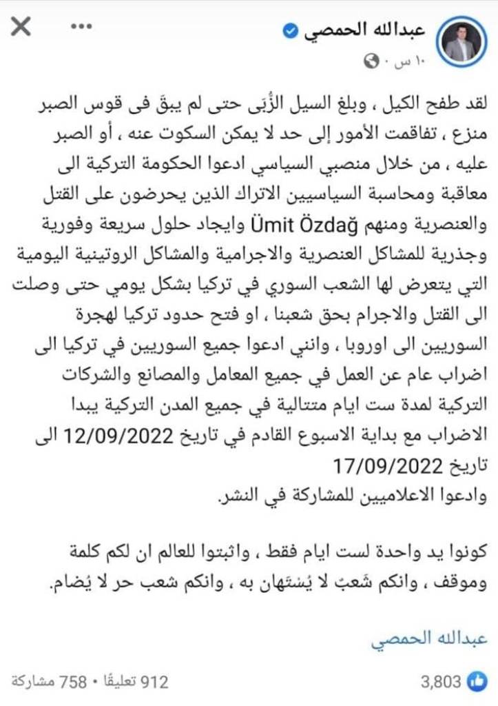 Suriyeliler kendileri aleyhinde açıklama yapan Türk siyasilerinin tutuklanması çağrısında bulundu. 12-17 Eylül 2022 arası Türkiye’de çalıştıkları yerlerde iş bırakma eyleminde bulunma tehdidinde bulunuyorlar.Sosyal medya platformu Twitter üzerinden yapılan paylaşımda Suriyelilerin kendileri aleyhinde açıklamalarda bulunanların tutuklanmasını istedikleri görüldü.Kaçak ve yasadışı yollarla ülkemize giriş yapan bu kişiler ayrıca çalıştıkları yerlerde iş bırakma eyleminde bulunacaklarını ifade ettiler.