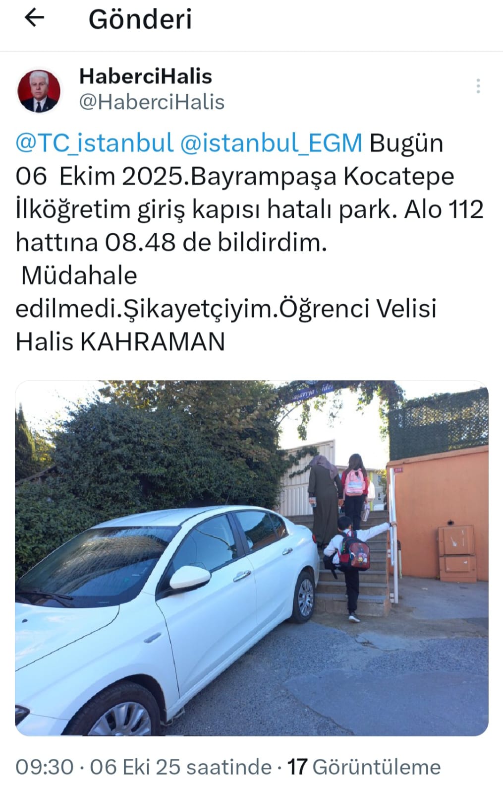 Öğrenci Velisi Halis Kahraman'ın CİMER aracılığıyla Emniyet Genel Müdürlüğü'ne ilettiği şikayetinde şu ifadeler yer aldı : "İstanbul Bayrampaşa Kocatepe İlköğretim Okulu giriş kapısı önünde 06 Ekim 2025 günü özel bir otomobilin hatalı park ederek, öğrenci girişini engellediğine tanık oldum. Bu durumu hem fotoğrafla tespit ettim hem de saat 08.48 sıralarında Alo 112 Çağrı Merkezine ihbar da bulunarak, bidirdiğim adrese polis ekibi ve araç çekicisi gönderilmesi talebinde bulundum. Ancak bu ihbarımın gereği yapılmadı.İhbarımın gereğini yapmayan görevlilerden şikayetçiyim. Kusurlu görevlilerin tespit edilerek, haklarında soruşturma açılmasını, disiplin cezası uygulanmasını ve neticeden tarafıma bilgi verilmesini talep ediyorum.."Şikayetçi Halis Kahraman'ın sosyal medya X hesabından İstanbul Valiliği ile İstanbul İl Emniyet Müdürlüğü'nü etiketliyerek kamuoyuna da duyurduğu paylaşımda ise şu ifadeleri kullandı: