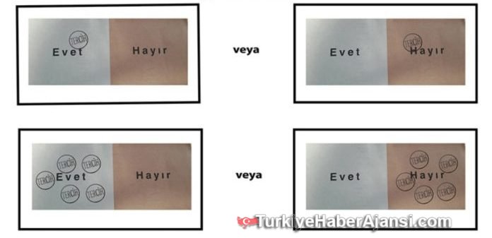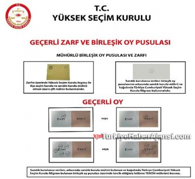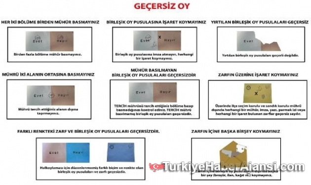 Yüksek Seçim Kurulu resmi internet sitesinden, geçerli ve geçersiz sayılacak oyları paylaştı.16 Nisan referandumuna günler kala Yüksek Seçim Kurulu vatandaşların oy kullanırken nelere dikkat etmesi gerektiği hususunda internet sitesi üzerinden bilgilendirme yayınladı.Sitede, tercih mührünün nasıl kullanılacağının yanı sıra, zarf ve pusulalar üzerinde hangi mühürlerin olacağı bilgisini verdi.Paylaşımda, oy verme işlemi sırasında yapılabilecek ve bu nedenle geçersiz sayılacak olası senaryolar görselleri desteğiyle anlatıldı.Yüksek Seçim Kurulu (YSK) oy kullanma işleminde yapılması gerekenleri de şöyle sıraladı:Web sitesi üzerinden açıklanan verilere göre oy kullanırken vatandaşların dikkat etmesi gereken hususlar ve hangi durumlarda oyların geçersiz sayılacağı görsellerle tek tek açıklandı.Açıklanan verilere göre oy verme kabinine Cep telefonuyla girmenin yasak olduğu belirtilerek bu kurala uymayanlara ceza verileceği bu nedenle oy kabinine girmeden önce cep telefonlarınızın sandık kuruluna emanet etmeniz gerektiği belirtildi.Oyunuzu Kullanırken Sandık kurulu görevlisi kimliğinizi alarak seçmen listesinde isminizi bulur ve kontrollerini yaptıktan sonra birleşik oy pusulası, zarf ve mührü size vererek kabinde oyunuzu kullanmanızı ister.ÖNEMLİ: "Cep telefonu, fotoğraf veya film makinesi gibi görüntü kaydedici veya haberleşme sağlayıcı cihazlarla oy verme yerine girilmesi yasaktır ve cezası bulunmaktadır.