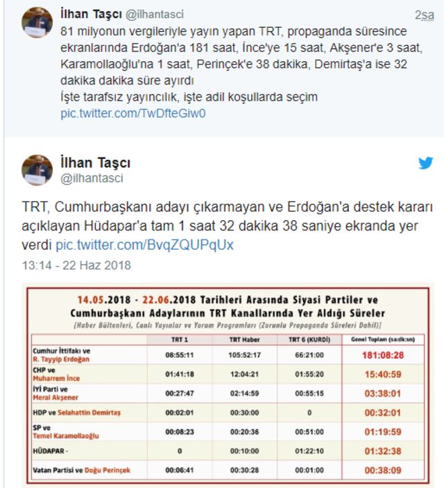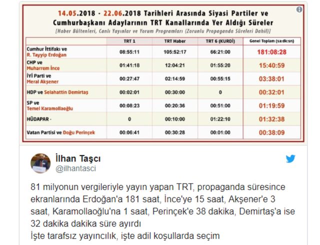 Taşçı'nın Twitter hesabından paylaştığı tabloya göre TRT, propaganda süresince ekranlarında 'Cumhur İttifakı'nın adayı Recep Tayyip Erdoğan'a 181 saat, CHP'nin adayı Muharrem İnce'ye 15 saat, İYİ Parti'nin adayı Meral Akşener'e 3 saat, Saadet Partisi'nin adayı Temel Karamollaoğlu'na 1 saat, Vatan Partisi'nin adayı Doğu Perinçek'e 38 dakika, HDP'nin cumhurbaşkanı adayı Selahattin Demirtaş'a ise 32 dakika dakika süre ayırdı.