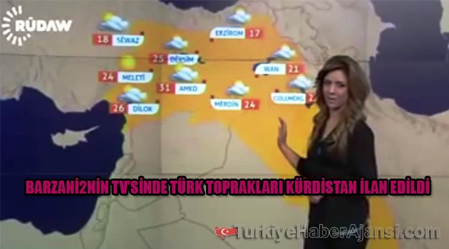 Irak Kürt Bölgesel Yönetiminin Mesut Barzani'ye yakınlığı ile bilinen televizyon kanalı Rudraw, Türkiye'nin Doğu ve Güneydoğusunu KÜRDİSTAN İlan etti...Kürdistan'ın devlet televizyonu olan RUDAW hava durumunda Türkiye'nin topaklarını kendi toprakları gibi gösterdi.