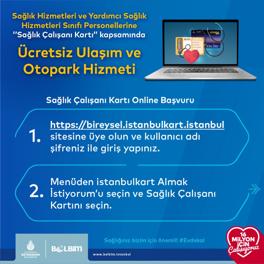 İstanbul Büyükşehir Belediyesi (İBB), Covit – 19 salgınıyla gece gündüz mücadele eden sağlık çalışanlarına tanıdığı ücretsiz ulaşım ve ücretsiz otopark hakkını, İstanbulkart ile yaygınlaştırıyor.İBB, Koronavirüs ile mücadelede çok hayati hizmetler veren sağlık çalışanlarına toplu ulaşım ve İSPARK otoparklarını 19 Mart’ta ücretsiz yapmıştı. Şimdi eczacılar gibi kurumsal kimliği olmayan çalışanların da bu uygulamadan yararlanabilmesi için İstanbulkart’lı kullanıma geçiliyor. İnternet üzerinden yapılan başvuru sonrası, kart adrese teslim ediliyor.İstanbul Büyükşehir Belediyesi (İBB), Covit – 19 salgınıyla gece gündüz mücadele eden sağlık çalışanlarına tanıdığı ücretsiz ulaşım ve ücretsiz otopark hakkını, İstanbulkart ile yaygınlaştırıyor.24 Mart’ta Resmi Gazete’de yayımlanarak yürürlüğe giren Cumhurbaşkanı Kararı’nın ardından, bu konuda Sağlık Bakanlığı ile işbirliğine gidildi.