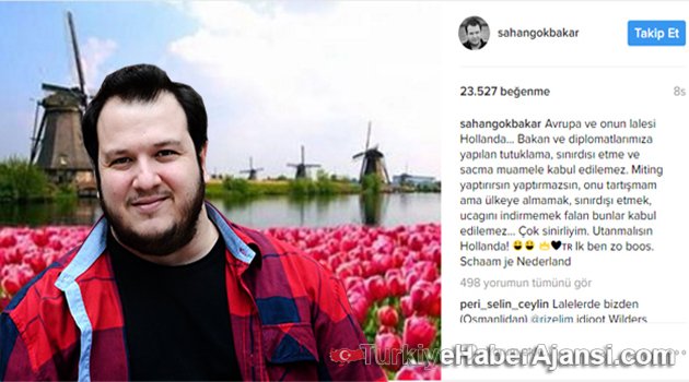 Recep İvedik adlı film serisiyle sinema dünyasına damga vuran ünlü komedyen Şahan Gökbakar, Hollan'da hakkında tepkisini ortaya koydu.Komedyen Gökbakar, lale çiçeğinin olduğu bir fotoğraf karesine, ''Avrupa ve onun lalesi Hollanda... Bakan ve diplomatlarımıza yapılan tutuklama, sınırdısı etme ve sacma muamele kabul edilemez. Miting yaptırırsın yaptırmazsın, onu tartışmam ama ülkeye almamak, sınırdışı etmek, ucagını indirmemek falan bunlar kabul edilemez... Çok sinirliyim. Utanmalısın Hollanda!'' notunu düştü.