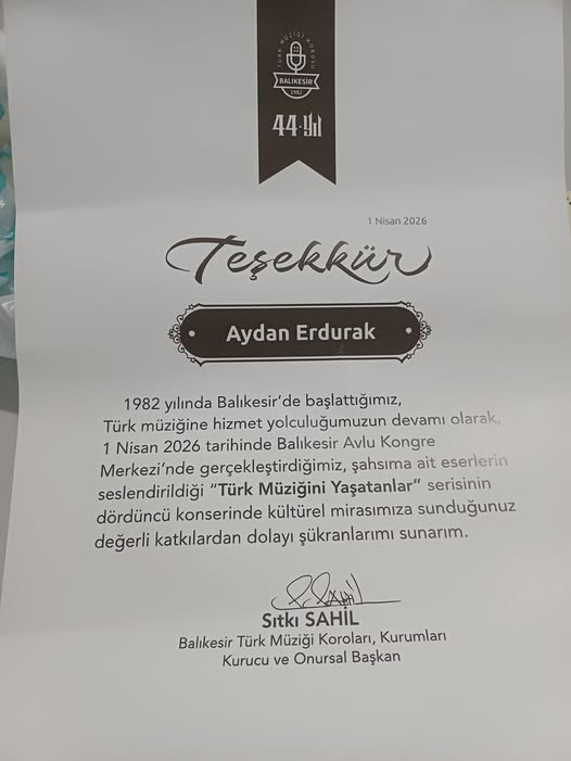Balıkesir’de düzenlenen “Türk Müziğini Yaşatanlar” konserler serisinin dördüncü konserine İzmir'den gelerek katılan kadın emekli polis memuresi şair ve söz yazarı Aydan Erdurak'a Balıkesir Türk Müziği Koroları,Kurumları Kurucu ve Onursal Başkanı Sıtkı Sahil tarafından kültürel mirasımıza sunduğu değerli katkılarından dolayı şükranlarını sunarak teşekkür belgesi takdim etti.