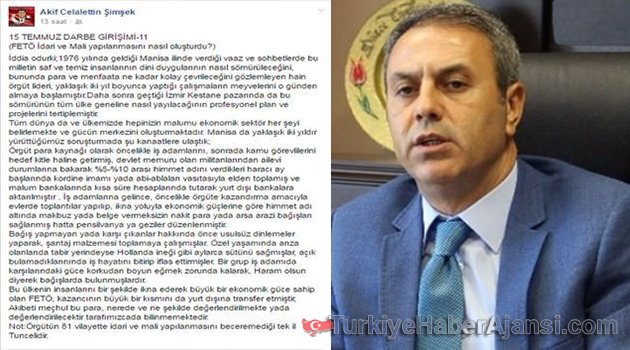 Manisa Cumhuriyet Başsavcısı Akif Celalettin Şimşek, Fethullahçı Terör Örgütü/ Paralel Devlet Yapılanması'nın (FETÖ/PDY) Manisa'da kamu görevlilerinden ay başlarında yüzde 5 ile 10 arasında 'himmet' parası toplandığını belirtip, "Para vermek istemeyen işadamlarına usulsüz dinlemeler yapıp, şantaj malzemesi toplamaya çalışmışlar.