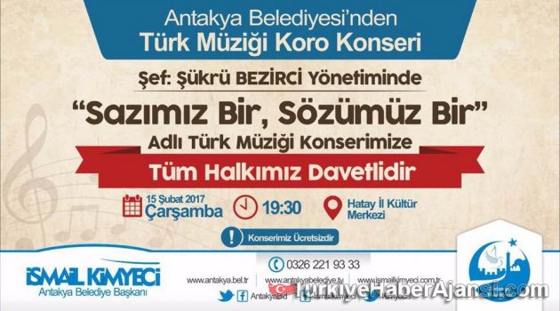Antakya Belediyesi Kültür ve Sosyal İşler Müdürlüğü Gençlik Merkezi bünyesinde faaliyet gösteren Türk Müziği Korosu, 15 Şubat Çarşamba akşamı saat 19.30’da Hatay İl Kültür Merkezi’nde düzenleyeceği konserle sanatseverlerle buluşmaya hazırlanıyor.Antakya Belediye Başkanı İsmail Kimyeci konuyla ilgili yaptığı açıklamada, “ Türk Müziği Koromuz, Koro Şefi Şükrü Bezirci yönetiminde ‘Sazımız Bir, Sözümüz Bir’ adlı konseri sunmaya hazırlanıyor. Ücretsiz gerçekleştirilecek konsere tüm hemşehrilerimizi davet ediyoruz.Türk Müziği’nin en güzel şarkılarını hemşehrilerimizle buluşturarak kültürümüzü yaşatmak, bu güzellikleri paylaşmak istiyoruz. Herkesi bu anlamlı konsere bekliyoruz.” dedi.