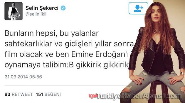 Selin Şekerci isimli şahıs Tiwtter üzerinden Cumhurbaşkanı Erdoğan'ın eşi Emine Erdoğan'a hakaret etti.Şekerci aynı zamanda ATV'de yayınlanan bir dizide rol alıyor. Bu paylaşımdan sonra sosyal medyada büyük tepki çeken Şekerci bu kadar tepkiye rağmen yazdıklarının arkasında olduğunu söyledi.