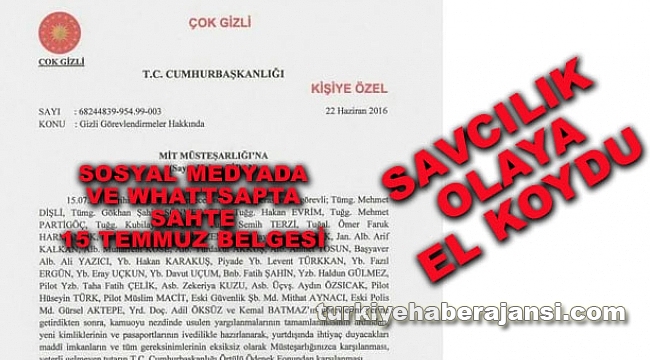Sosyal Medyada Cumhurbaşkanlığı'ndan MİT'e gönderilmiş gibi gösterilen Sahte '15 Temmuz' belgesi dolaştırılıyor. Cumhurbaşkanlığı'ndan MİT'e gönderildiği ileri sürülen sözde belgede, darbe girişiminin tüm ayrıntıları planlanıyor. Üst düzey bürokrasi kaynakları, belgeyi 'Gülünç ve acemice hazırlanmış' sözleriyle değerlendirdi.Son günlerde "Cumhurbaşkanı Recep Tayyip Erdoğan" imzalı darbede rol alanların görevlendirildiğini ileri süren sözde bir "15 Temmuz darbe planı" belgesi yayılmaya başlandı. Özellikle sosyal medya ve Whatsapp gruplarında dolaştırılan ve darbe girişiminden yaklaşık 1 ay önce hazırlanmış gibi gösterilen 22 Haziran 2016 tarihli sözde belgeye göre, 15 temmuz 2016'da gizli bir operasyon yapılacağı bildiriliyor.Cumhurbaşkanlığı'ndan MİT'e gönderilmiş gibi gösterilen bu sözde belgede, darbe girişiminde rol alan generallerin, göstermelik yargılamalar sonrası serbest bırakılarak yurt dışına çıkışlarının sağlanması talimatı veriliyor. Üstelik yeni kimlik ve pasaport hazırlanması da isteniyor! Generallerin yanı sıra Adil Öksüz ve Kemal Batmaz için de aynı prosedürün uygulanması talimatı veriliyor.GÜLÜNÇ VE ACEMİCE