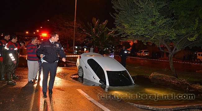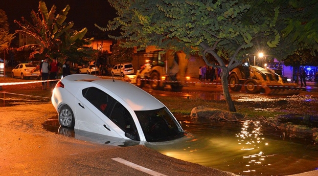 Olay, merkez Yüreğir ilçesinde meydana geldi. Mustafa Kemal Paşa Bulvarı’nda geçen Adana Büyükşehir Belediyesi Su ve Kanalizasyon (ASKİ) Müdürlüğü’ne ait içme suyu ana hat borusunun yüksek basınçla patlaması sonucu, yolda göçük ve taşkın oluştu.AÇILAN ÇUKURA ARAÇ DÜŞTÜBu sırada yoldan geçen Levent Göler’in idaresindeki otomobil, açılan göçüğe düştü. Göler, kendi imkanlarıyla araçtan çıkmayı başarırken, haber verilmesi üzerine ASKİ yetkilileri ana boru hattına gelen suyu kesti, bölgeye iş makineleri sevk edildi. Yolun sağından gittiği sırada arkadan gelen ambulansa yol vermek için şerit değiştirince içi su ile dolan çukura düştüğünü belirten Göler, “Su birikintisi vardı. Tereddüt ettim geçip geçmemek konusunda. Kaldırım gibi görünüyordu. Hafiften ilerleyince sonrasını siz de gördünüz” diyerek yaşadıklarını anlattı.YOLDA ÇALIŞMA BAŞLATILDIYolu kaplayan su kısa sürede tahliye edilirken, çukura düşen otomobil de iş makineleri yardımıyla çıkartıldı. Adana Büyükşehir Belediyesi ekipleri, patlayan boruyu değiştirip, çöken yolu onarmak için çalışmalara devam ediyor.