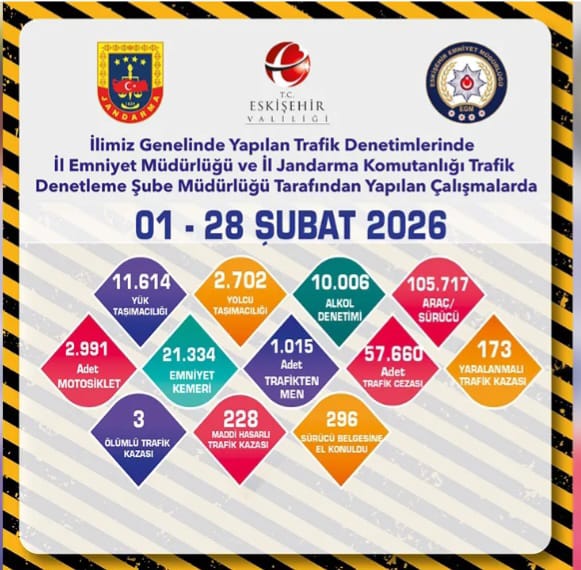 Eskişehir Valiliği, İl Emniyet Müdürlüğü ve İl Jandarma Komutanlığı Trafik Denetleme Şube Müdürlüğü ekiplerince Şubat ayı boyunca il genelinde gerçekleştirilen kapsamlı trafik denetim raporunu açıkladı.Eskişehir’de 1-28 Şubat 2026 tarihleri arasında gerçekleştirilen trafik denetimlerinde 105 bin 717 araç ve sürücü kontrol edildi. Denetimlerde 57 bin 660 trafik cezası uygulanırken, 3 ölümlü ve 173 yaralanmalı kaza meydana geldi.