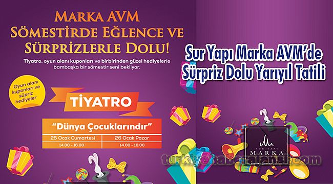 Sur Yapı Marka AVM, sömestir tatiline giren çocuklar için sürpriz hediyeler ve etkinlikleri ayaklarına getirmeye hazırlanıyor.Tatil boyunca alışveriş merkezinde gezinen çocuklar her an karşılarına çıkmaya hazırlanan çok sayıda sürpriz hediyelerin sahibi olacak. Joypark, Trambolin, Kummy oyun alanı kuponlarının yanı sıra Minti Monti Çocuk Dergisi ve birbirinden renkli sürpriz oyuncaklar AVM’nin minik ziyaretçileri için karne hediyesi olarak sunulacak.25 – 26 Ocak’ta ise 14.00 ve 16.00 seanslarında gerçekleşecek “Dünya Çocuklarındır” adlı müzikal oyunla tatil keyfi doruklarda yaşanacak.Türkiye’nin en seçkin markalarını Bursalılarla buluşturan Sur Yapı marka avm sömestir tatilinde çocuklar için renkli etkinlikler ve sürpriz hediyeler sunmaya devam ediyor.Yarıyıl tatili boyunca Sur Yapı Marka AVM’yi ziyaret edecek çocuklar, alışveriş merkezi tarafından karne hediyesi olarak sunulacak, Joypark, Trambolin, Kummy oyun alanı kuponlarının yanı sıra Minti Monti Çocuk Dergisi ve sürpriz oyuncakların sahibi olacak.Sürpriz karne hediyeleriyle tatil keyfini bir arada yaşayacak çocuklar “Dünya Çocuklarındır” adlı müzikal oyunla çevreye duyarlı olmayı öğrenecek.Alışveriş merkezinin eksi birinci katında sahnelenecek oyun, çocuklara çöp ayrıştırmanın önemini, toprakların, denizlerin ve içtiğimiz suların gitgide daha da kirlendiğini ve önlemek için nelerin yapılması gerektiğini anlaşılır bir dille anlatacak. Etkinlik, 25 - 26 Ocak’ta, 14.00 ve 16.00 seanslarında sahnelenecek.