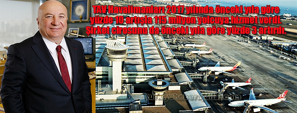 TAV Havalimanları 2017 yılında önceki yıla göre yüzde 10 artışla 115 milyon yolcuya hizmet verdi. Şirket cirosunu da önceki yıla göre yüzde 3 artırdı. Havalimanı işletmeciliğinde Türkiye’nin dünyadaki önemli markası