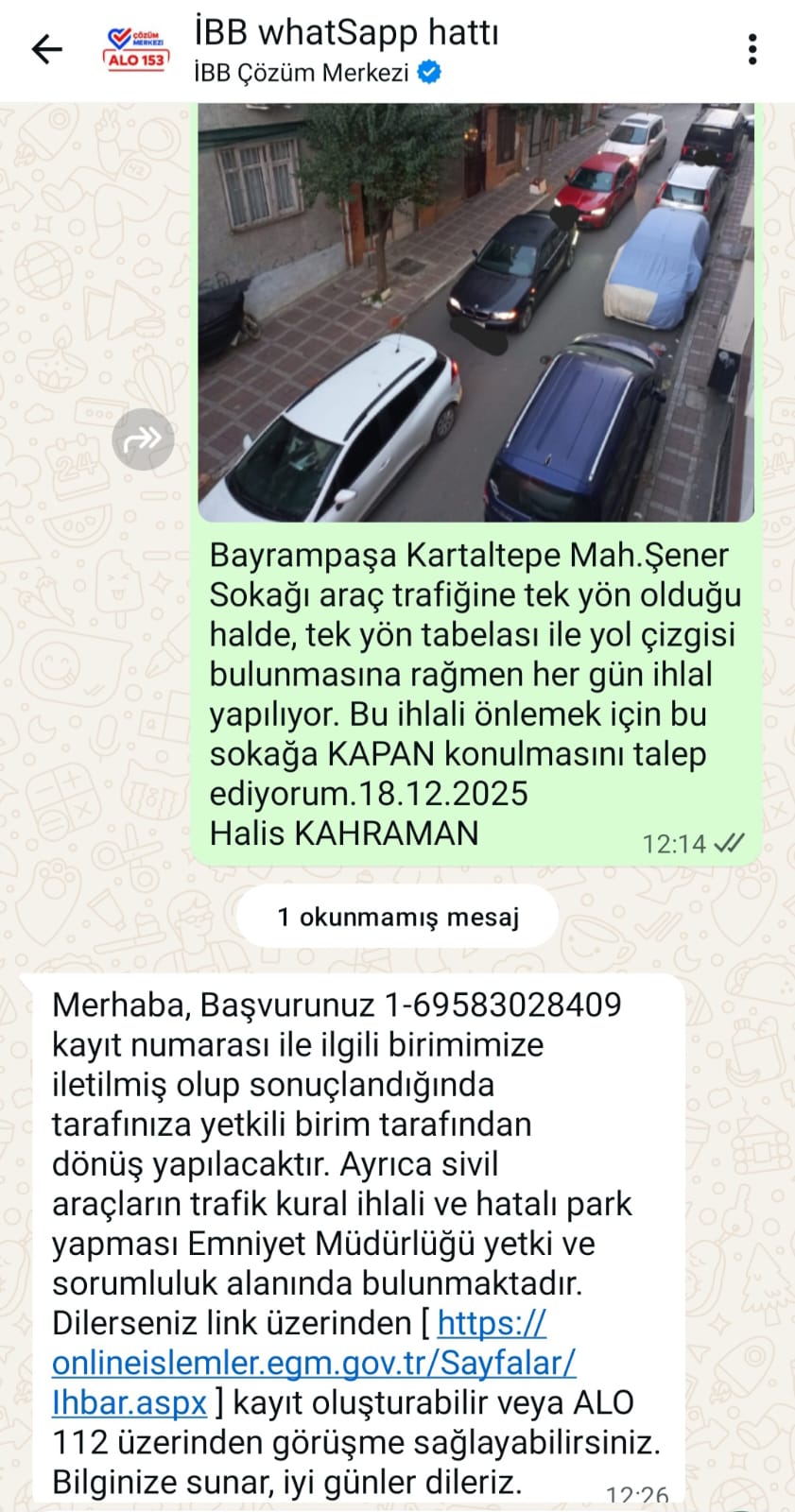 Trafik Güvenliğine duyarlı olan Gazeteci Halis Kahraman, İstanbul Büyükşehir Belediyesi (İBB) whatSapp hattına başvuru yaparak, Bayrampaşa Kartaltepe mahallesi Şener sokağı araç trafiğine tek yön olduğu halde, tek yön tabelası ile yol çizgisi bulunmasına rağmen her gün ihlal yapıldığını belirterek, bu bu ihlallerin engellenmesi sokağa Kapan konulması talebinde bulundu. Halis Kahraman'ın başvurusunda şu ifadeler yer aldı :
