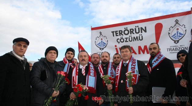 Haber: Fedai Çakır İstanbul Beşiktaş Vodofane Arena Stadyumu yakınında, Beşiktaş-Bursaspor maçının ardından iki ayrı terör saldırısının da hayatını kaybedenleri anmak ve Kayseri'de yaşanan terör olaylarını lanetlemek için İstanbul Trabzon Federasyonu yönetimi, üyeleri bir araya gelerek "TERÖRE HAYIR, İDAMA EVET" dediler.Terörün kaynağının kurutulması için İdam cezasının yeniden ivedilikle geri getirmesini talep eden Federasyon üyeleri, Kaysersiden katılan kalabalık bir grup ile sloganlar ve dualar eşliğinde teröre hayır dediler.Bir basın açıklaması yapan İstanbul Trabzon Federasyonu genel başkanı Dursun Çağlayan; "Terör ile iç içe yaşamaya ve bizleri Teröre alıştırmaya çalışanlara bir kaç sözümüz bulunmaktadır. Gün geçmiyor ki topraklarımızda bir terör eylemi ile karşılaşmayalım. Her gün ülke topraklarımızdan şehit haberleri gelmektedir. Bu gün de Kayseri Erciyes Üniversitesi yakınındaki patlamanın, ilk bilgilere göre bomba yüklü bir araçla, çarşı iznine çıkan askerlerimiz hedef alındı. Daha burada İstanbul Beşiktaş Vodofane Arena Stadyumu yakınında gerçekleşen terör saldırısının yaralarını saramamışken yeni bir saldırı ile toplum olarak karşı karşıyayız.Terörle mücadele eden Türkiye'nin ve Türk milletinin yanında yer almak yerine, terör örgütlerini ve teröristleri desteklemeyi tercih eden ülkelerin, kurumların, siyasilerin bu olaylardan sonra farklı davranmalarını beklemek rüyada olmakla aynı anlama gelmektedir.Ülke olarak Rüyalardan uyanıp bir an önce ülke gündemini sürekli meşgul eden terör ve tecavüz olaylarına ivedilikle çözüm yoluna gidilmelidir. Bu çözüm yolu da terör ve tecavüz olaylarına karışanların idam ile yargılanması ve yargı sürelerinin de hızla sonuçlanması ile olacağıdır.İstanbul Trabzon Federasyonu olarak bu konuda yüce Türk milleti ve Türkiye Cumhuriyeti Büyük Millet Meclisinin yanındayız.Terör olaylarında kaybettiğimi bütün şehitlerimize rahmet yaralılarımızda acil şifalar dileriz." dedi.İstanbul Trabzon Federasyonu yönetimi şehitler için dualar ettikten sonra bordo mavi renkli atkıları vatandaşlara dağıttılar.