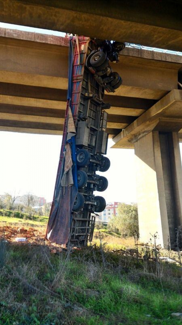 Alınan bilgiye göre, TEM Otoyolu'nda İstanbul istikametine giden Murat Kara idaresindeki 61 K 21009 plakalı tuğla yüklü tır, Gaziler viyadüğünde yoldan çıktı.Dorsesi 20 metreden aşağıya devrilen tırın çekicisi, iki viyadük arasında sıkıştı.Vatandaşlar tarafından araçtan çıkarılan yaralı sürücü Kara, olay yerine gelen 112 acil servis ekiplerince Fatih Devlet Hastanesine kaldırıldı.Yaklaşık 1,5 saat trafiğe kapanan yol, çevreye dağılan tuğlaların temizlenmesinin ardından ulaşıma açıldı.Tırın viyadükler arasından çıkarılmasına yönelik çalışmanın daha sonra yapılacağı bildirildi.
