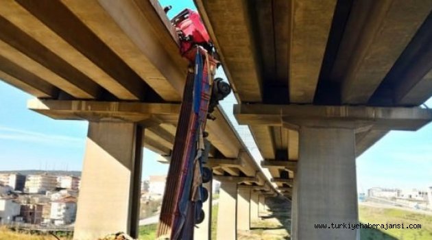 Kocaeli'nin Gebze ilçesinde, yoldan çıkarak iki viyadük arasında sıkışan tırın sürücüsü yaralandı.