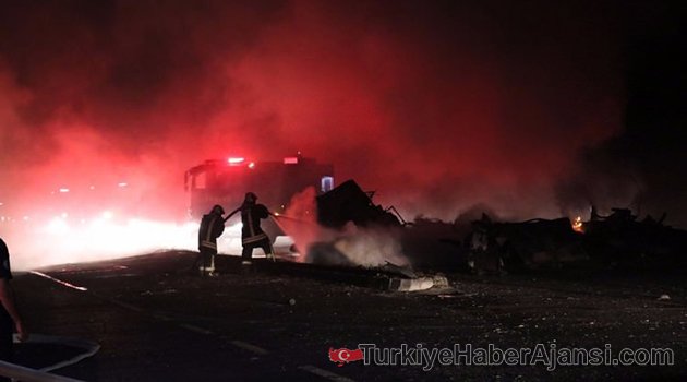 Denizli'nin Sarayköy İlçesi'ndeki yangına müdahale etmek üzere iş makinesi götüren TIR, Aydın'dan Denizli istikametine giden akaryakıt yüklü tanker ile çarpıştı..