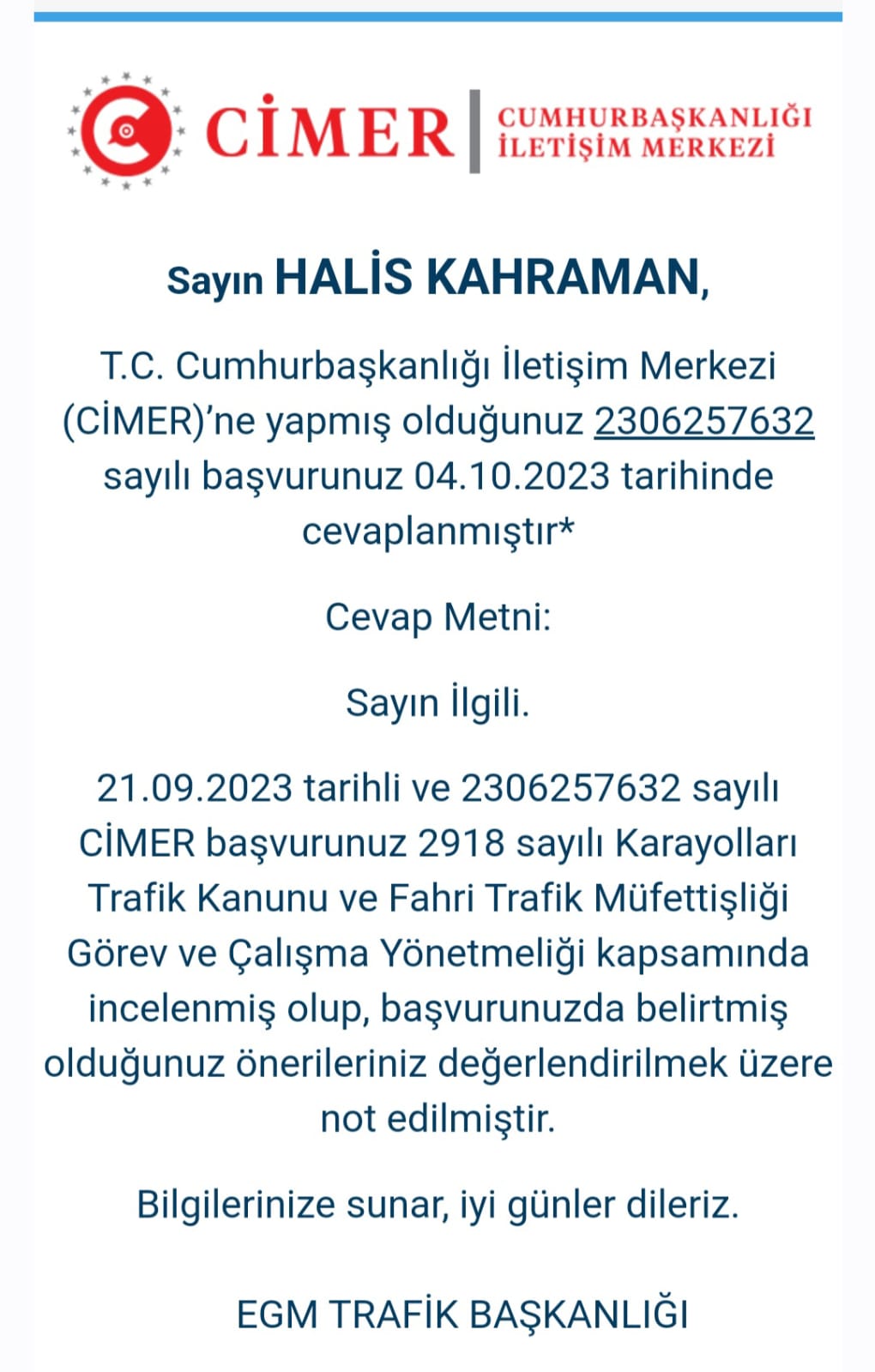 Emniyet Genel Müdürlüğü (EGM) Trafik Başkanlığı tarafından CİMER aracılığıyla Halis Kahraman'a iletilen cevabi yazıda şu ifadeler yer aldı :