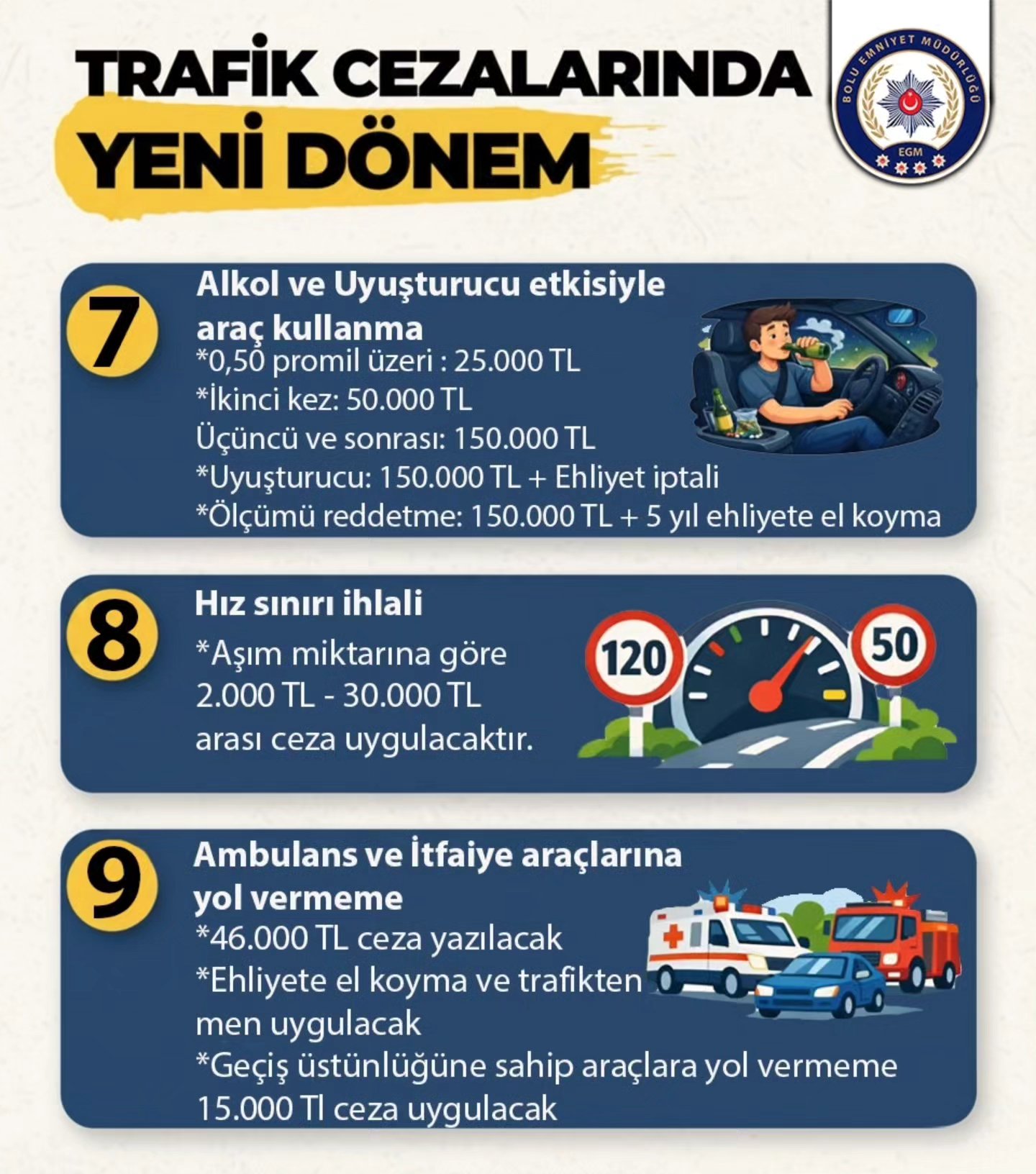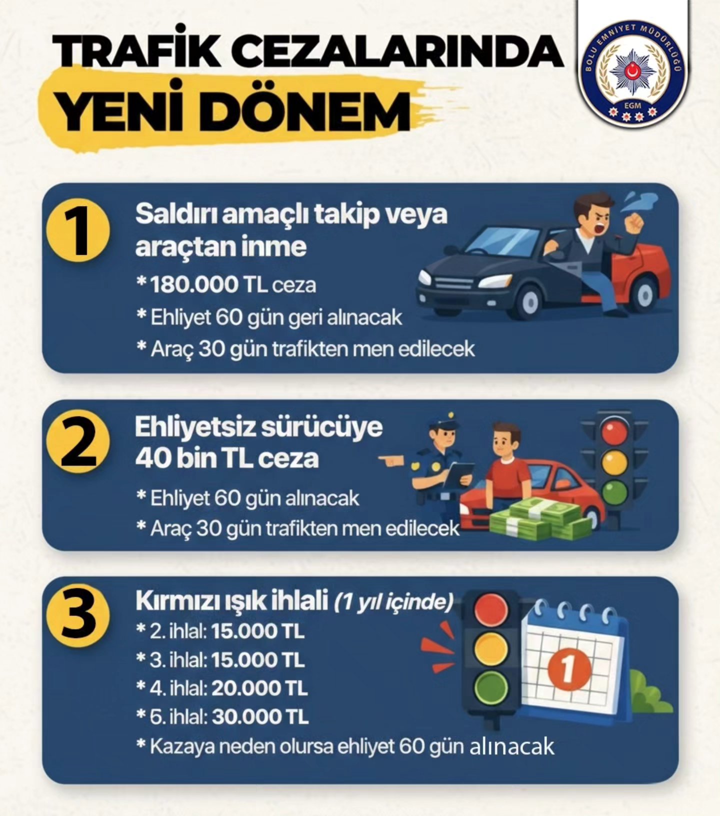 Bolu İl Emniyet Müdürlüğü, sosyal medya hesabından Karayolu Trafik kanunu'nda köklü değişiklikler içeren yasanın 27 Şubat 2026 günü yürürlüğe girmesinin ardından trafik cezalarında yeni dönemde yapılan değişiklikleri görseller ile kamuoyuna paylaşarak duyurdu.