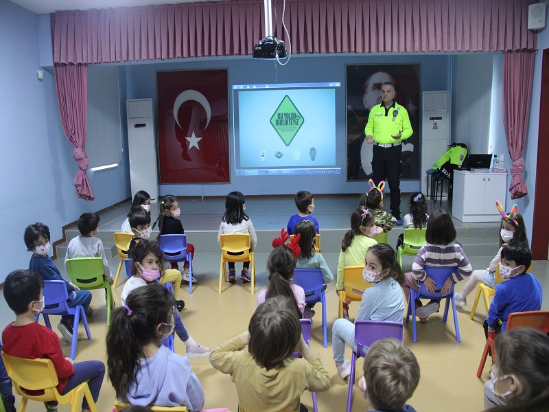 Çocuklarımıza verilen eğitimde; karşıdan karşıya geçiş kuralları, araç içerisinde yapacakları seyahatlerinde çocuk koltuğuna oturup emniyet kemeri kullanmaları, trafik lambaları, trafiğe kapalı alan, güvenli oyun alanları konularında bilgilendirmeler yapılmaktadır."