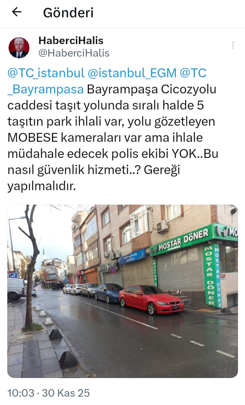 Cadde sakinleri adına gazeteci Halis Kahraman'ın CİMER aracılığıyla Emniyet Genel Müdürlüğü'ne ilettiği 30.11.2025 tarih ve 2504981543 başvuru sayılı şikayet dilekçesinde şu ifadeler yer aldı : "İstanbul Bayrampaşa Kartaltepe Cicozyolu caddesi taşıt yolunda " Park yasaktır.." trafik levhası ve yolu gözetleyen " MOBESE " kameraları bulunmasına rağmen, uygunsuz park ederek sabah saatlerinde trafik akışını 5 aracın kilitlediğine tanık oldum. Bu durumu 112 Acil Çağrı Merkezi’ni 30 Kasım 2025 günü aralıklı saat diliminde 3 kez telefonla arayarak ihbar da bulundum. Bu taşıt yolunda hatalı parklanmaları gösteren fotoğraf ilişikte delil olarak sunulmuştur.Bu araçların polis araç çekicisi marifetiyle bulunduğu yerden kaldırılarak, kilitlenen trafik akışının sağlanmasını ve araç sürücülerine ceza uygulanmasını istedim. Ancak bu 3 ihbarımın gereği yapılmadı. İhbar saatleri ile araç plakaları tarafımdan tespit edilmiş olup kayıt altındadır. Cadde sakinleri gürültüden, araç sürücüleri de trafik akışının kilitlenmesinden dolayı her gün mağdur ediliyor. Anılan bu noktada hemen hemen her gün trafik akışında aksamalar yaşanmakta olup, araç sürücüleri bu duruma korna çalarak tepki göstererek cadde sakinlerinin huzur ve sükununu erken sabah saatlerinde bozmaktadırlar.Gazeteci kimliğimden dolayı cadde sakinleri bu mağduriyetlerini bana sık sık iletiyorlar. Ben de onların bu sıkıntılarına bu yolu sık kullandığımdan dolayı tanık oluyorum.Bu aksaklığın giderilmesi amacıyla, bu adres için yapılan ihbarların gereğini yapmayarak, görevi ihmal suçu işleyen ilgili görevlilerden şikayetçiyim. Bu aksaklığa müdahalede bulunmayan ilgili görevliler hakkında idari yönden disiplin soruşturması açılmasını ve cezalandırılmalarını istiyorum. Neticeden tarafıma bilgi verilmesini talep ediyorum."Gazeteci Halis Kahraman, sosyal medya X hesabından İstanbul Valiliği, İstanbul Emniyet Müdürlüğü ve Bayrampaşa Kaymakamlığı'nı etiketleyerek paylaştığı gönderisinde şu ifadeleri kullandı :